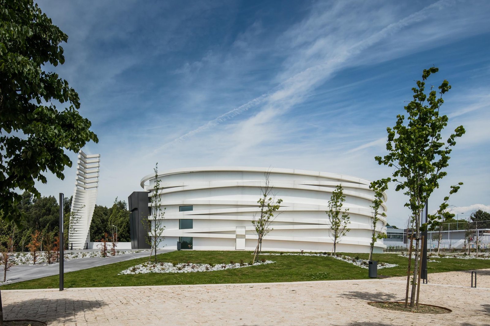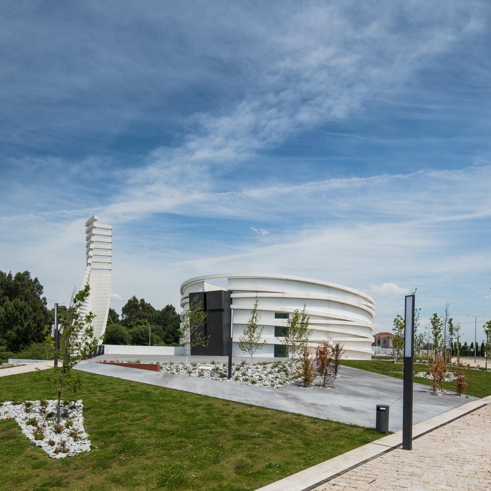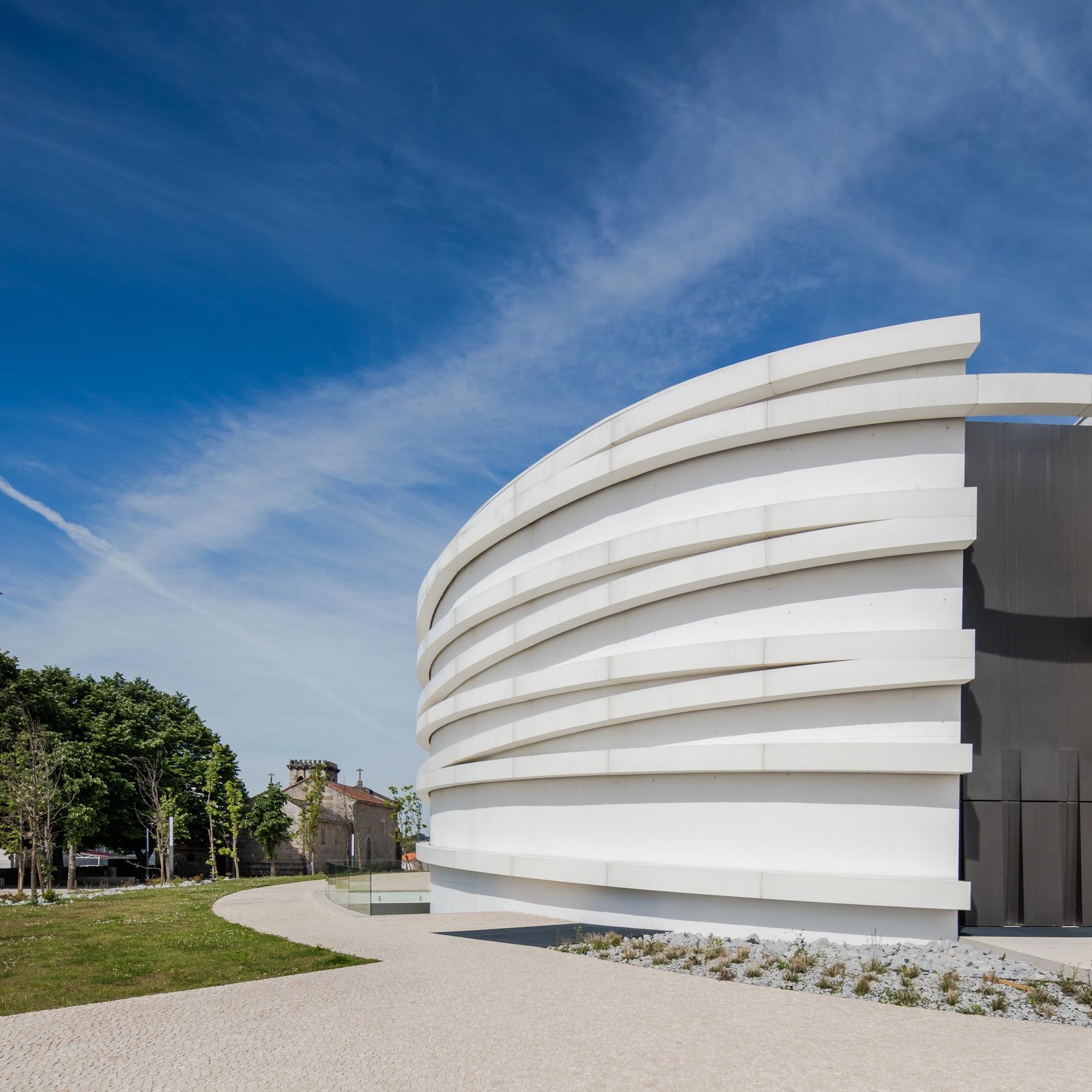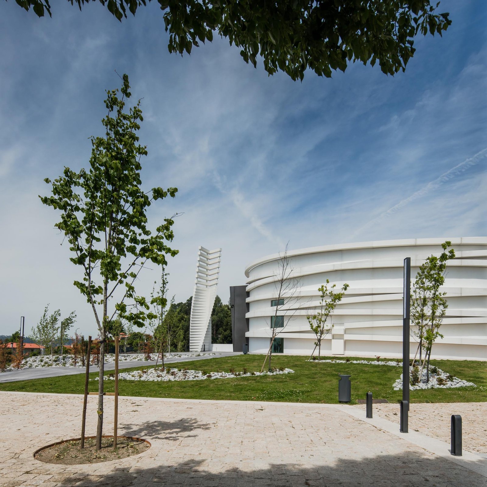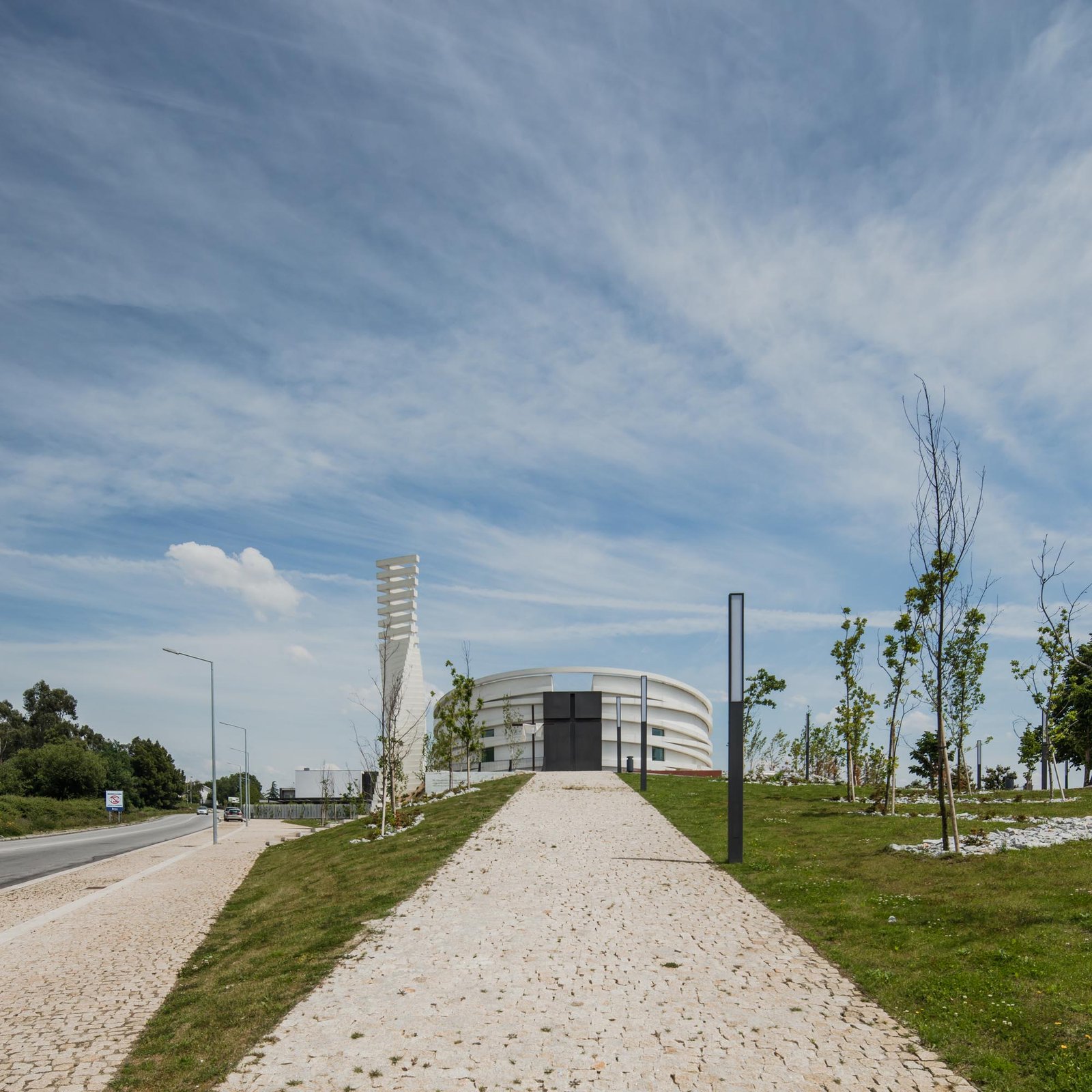 El volumen materializa su forma a través de las paredes exteriores de hormigón con casi ninguna abertura, lo que incorpora una imagen misteriosa y austera, a pesar de los arcos suspendidos que lo abarcan.