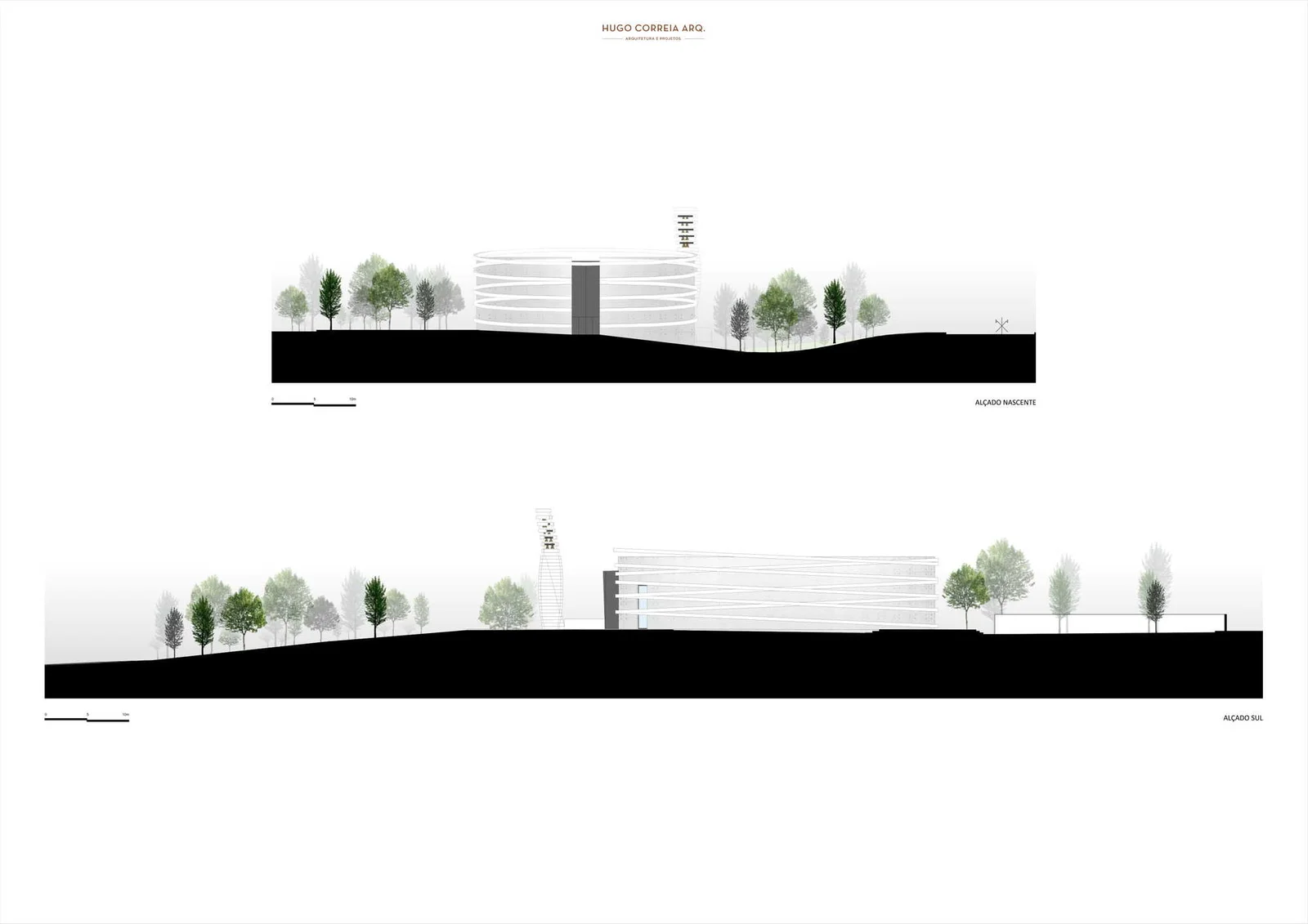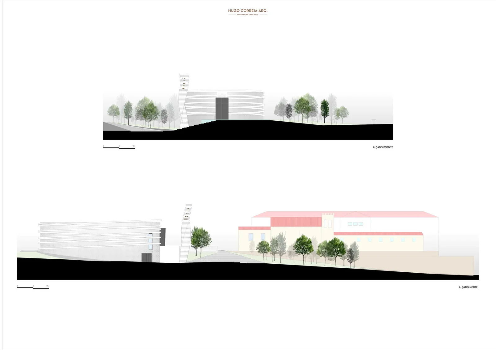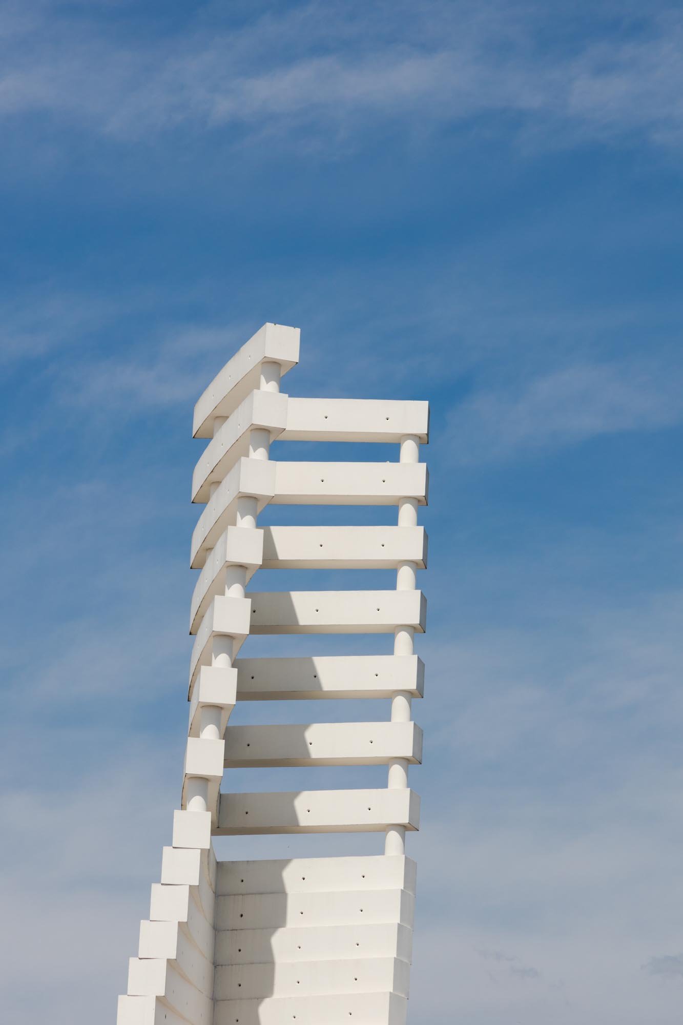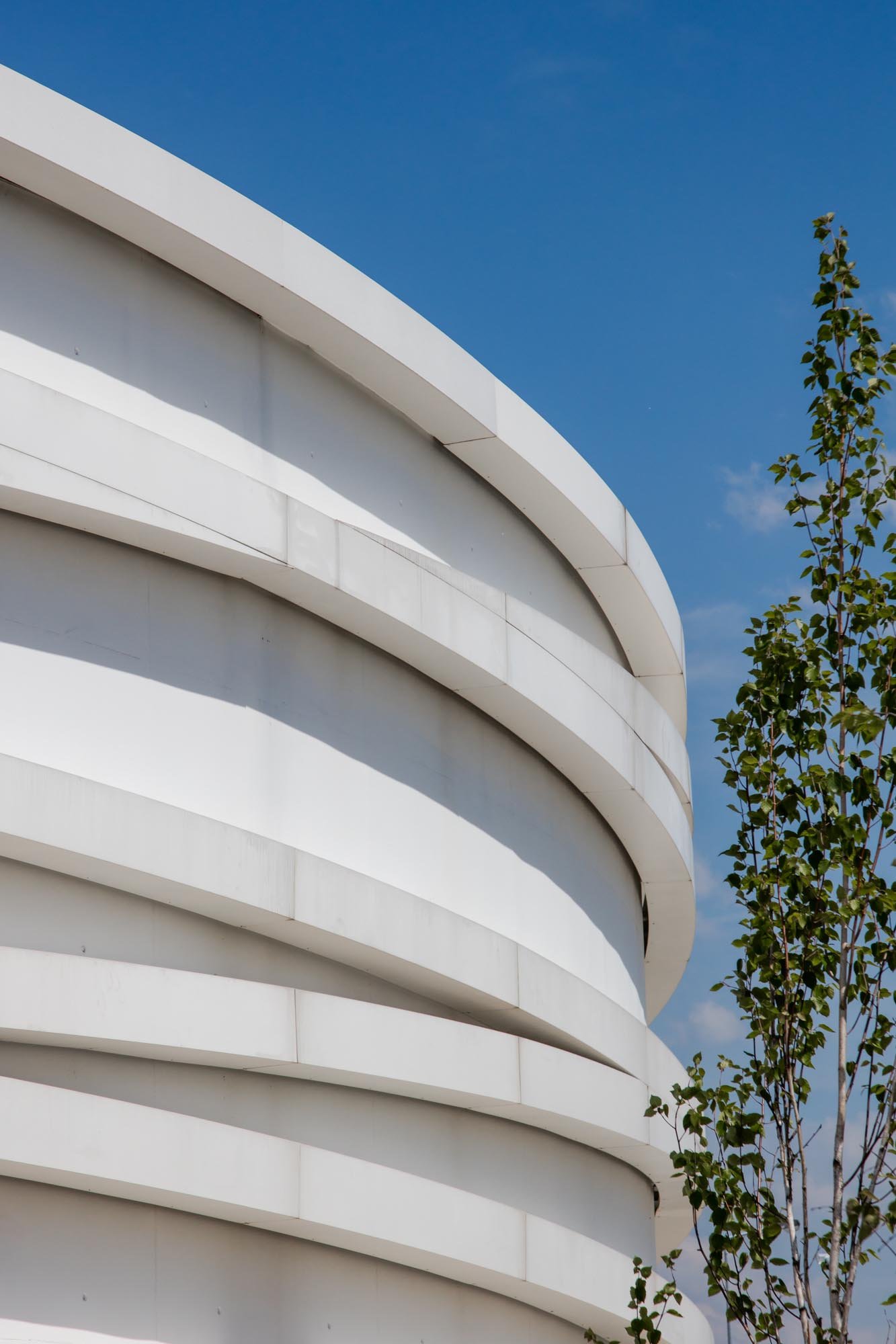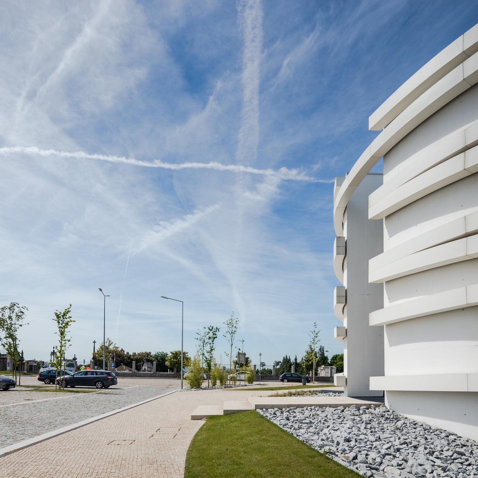 El volumen materializa su forma a través de las paredes exteriores de hormigón con casi ninguna abertura, lo que incorpora una imagen misteriosa y austera, a pesar de los arcos suspendidos que lo abarcan.