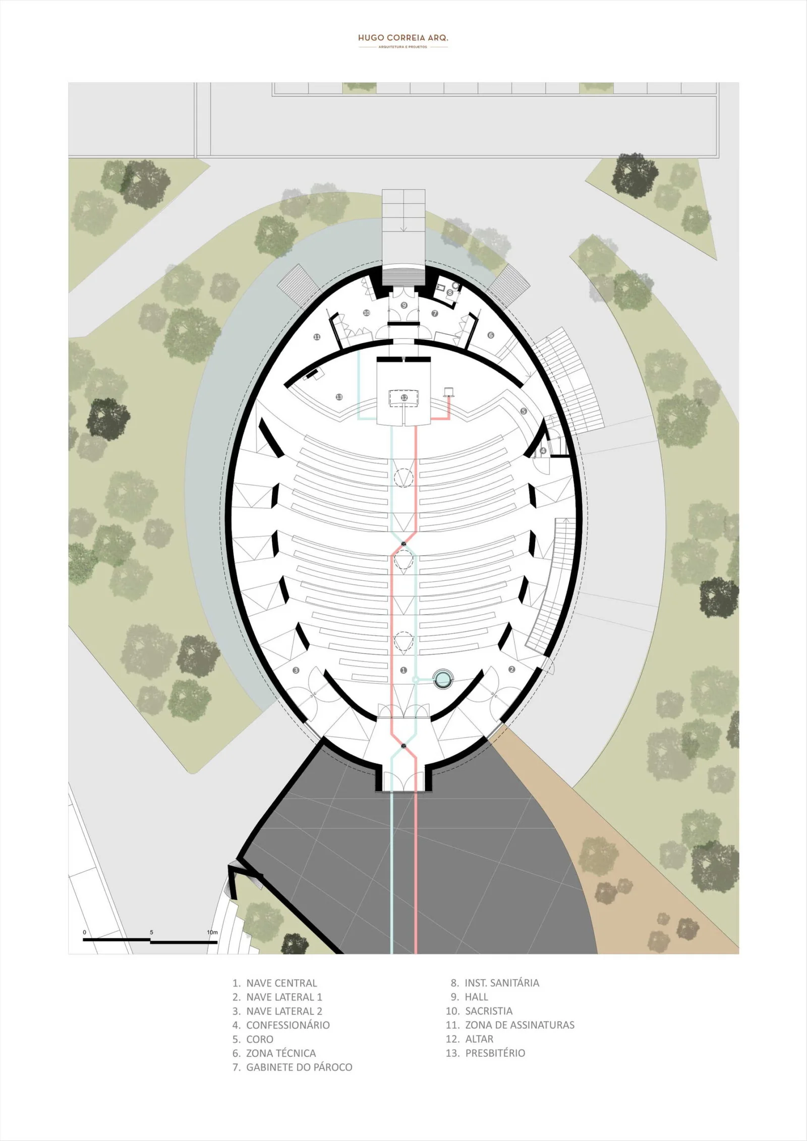 La elaboración de la propuesta fue precedida de un estudio de la ubicación de los espacios circundantes y la integración del edificio en el lugar. No se limitó simplemente al estudio de una implantación organizada en el terreno, sino también a un intenso estudio de la historia y las actividades religiosas asociadas a la localidad. Su implantación funciona como un elemento unificador de los espacios existentes en el entorno, como la iglesia románica (clasificada como Bien de Interés Público desde 1958), la capilla mortuoria y el cementerio.