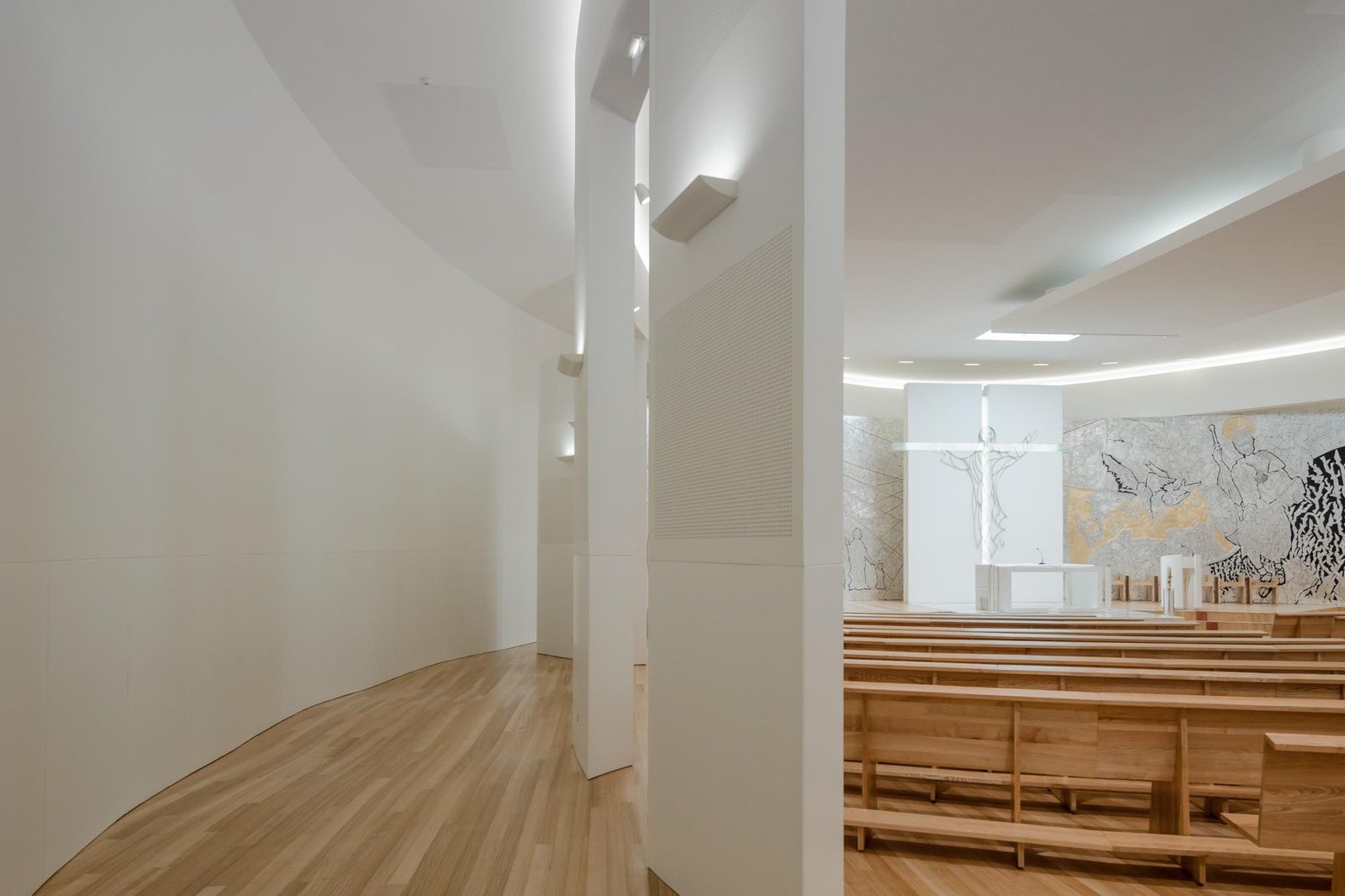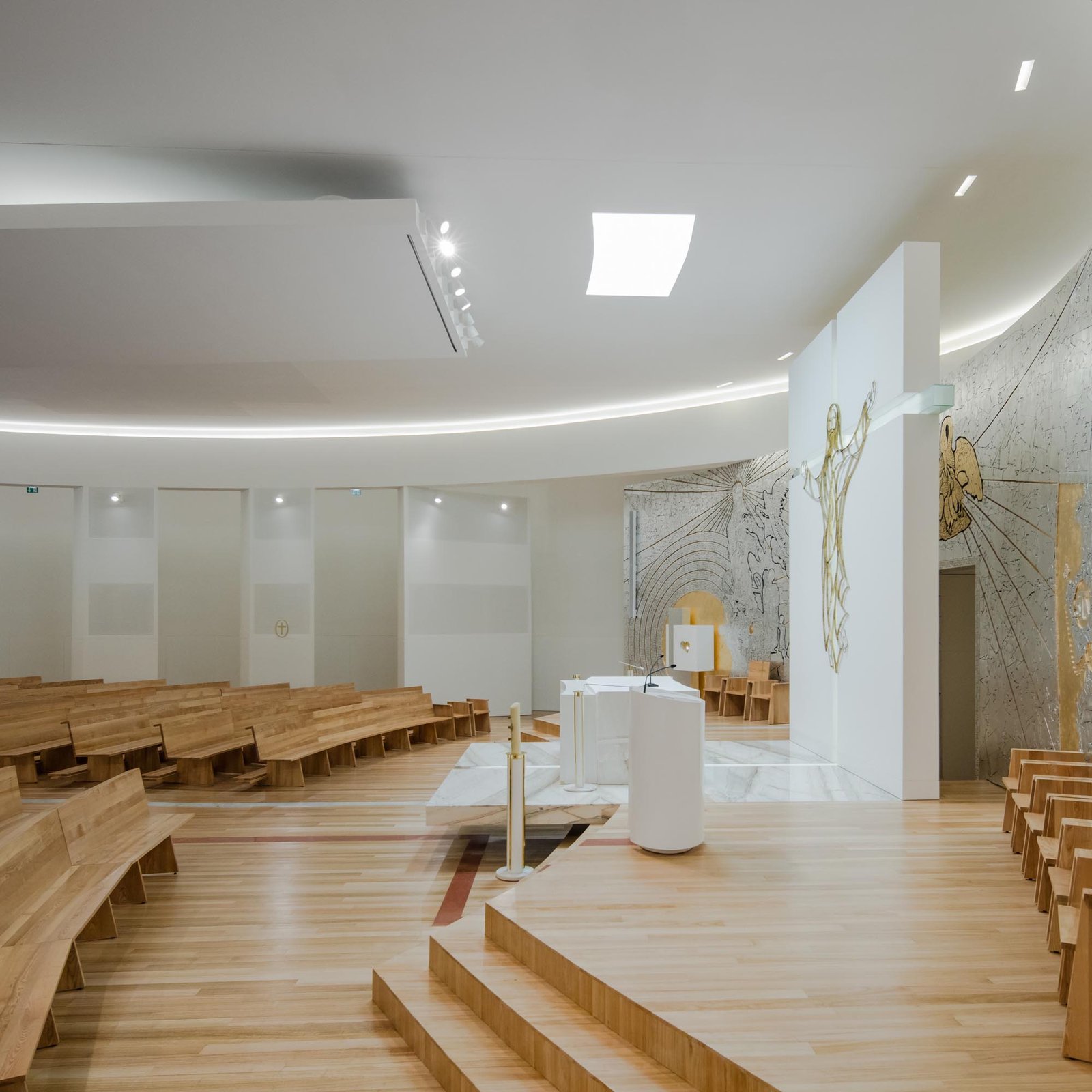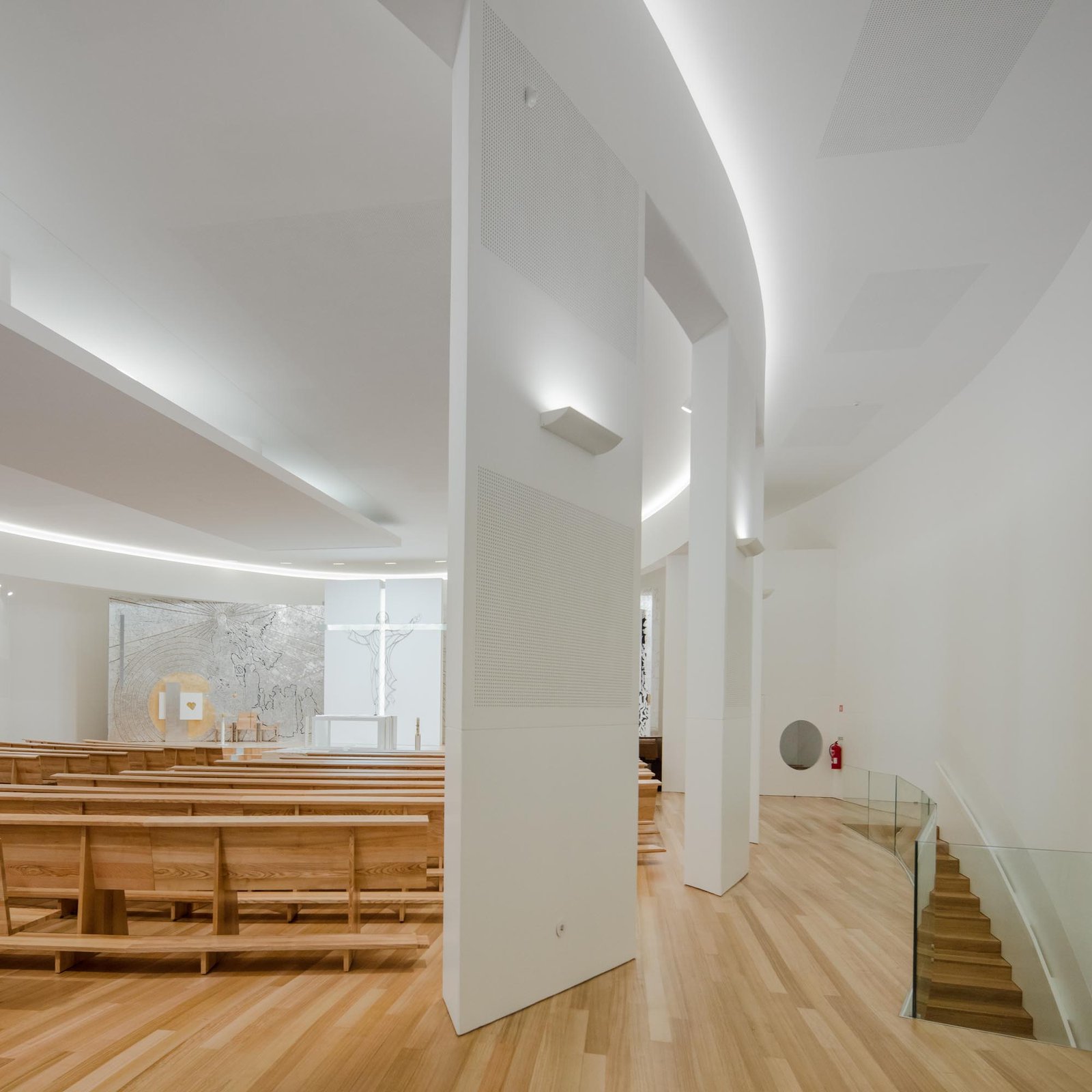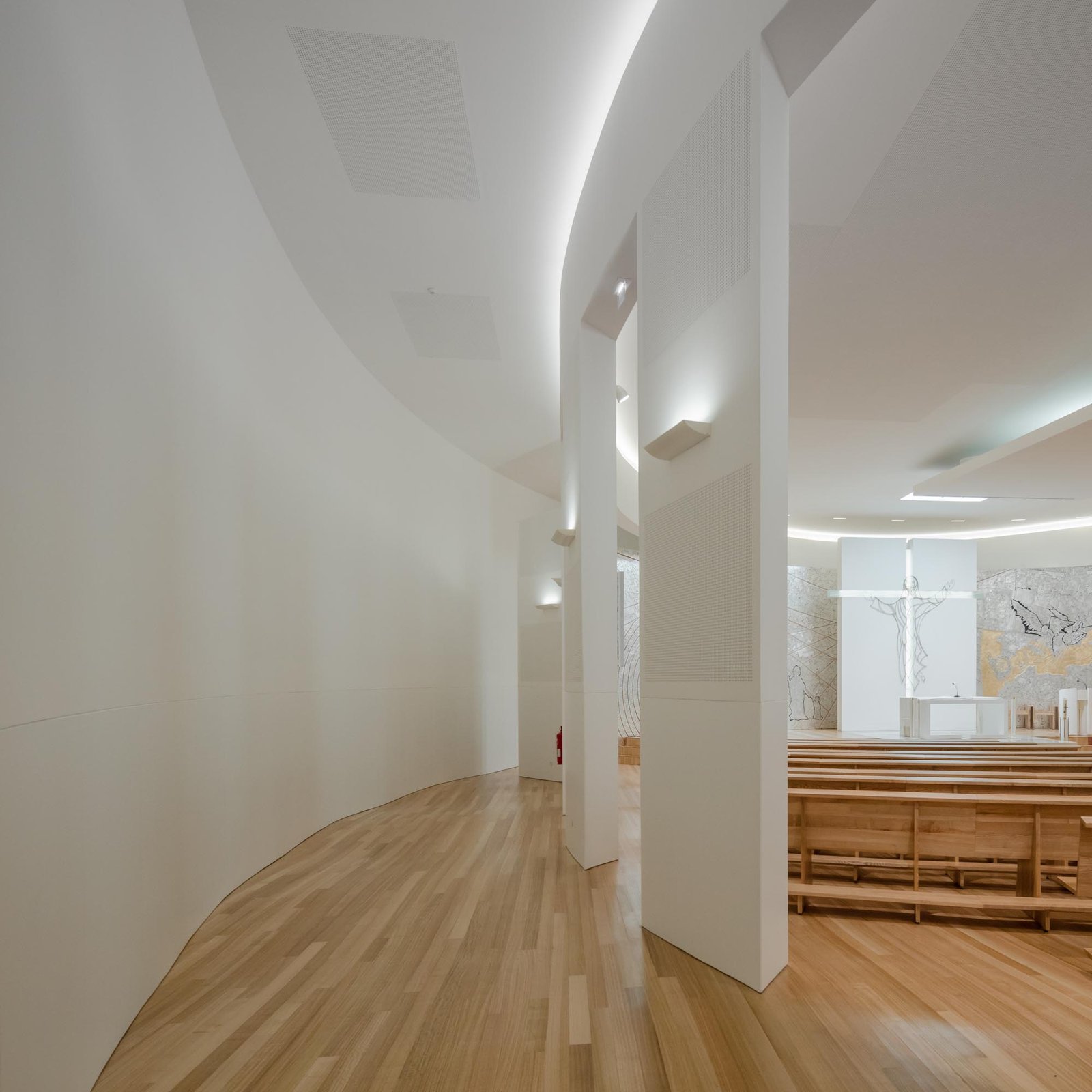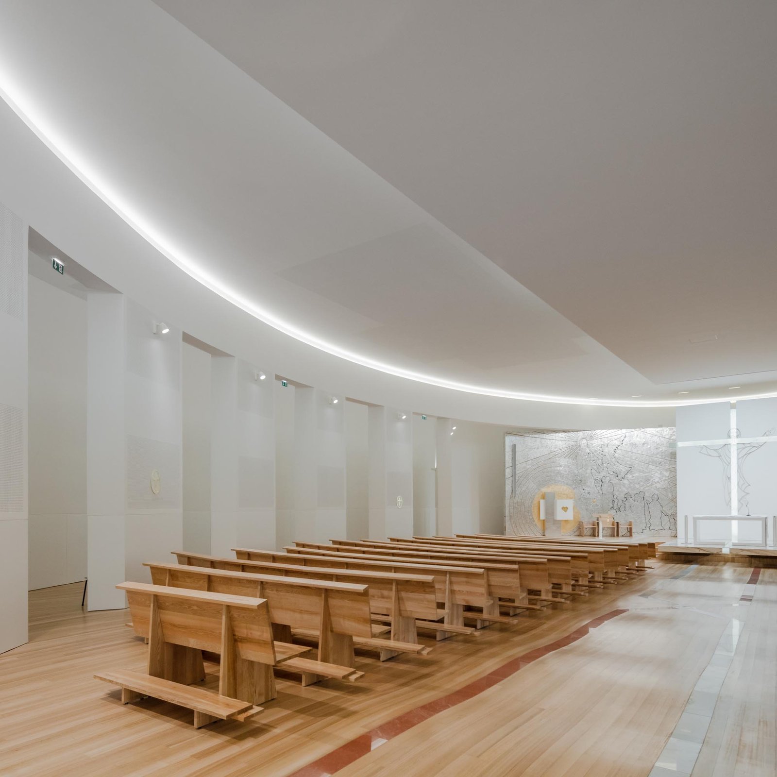 Por otro lado, las paredes interiores blancas de la nave están iluminadas por una luz difusa, creada por tragaluces ocultos que transmiten al lugar una atmósfera serena y poética que evoca la oración y la reflexión. La iluminación juega un papel importante en la intervención. Durante la noche hay un efecto de iluminación cuidadoso y articulado, tanto en el interior como en el exterior, que se desarrolló con el objetivo de realzar la iglesia.