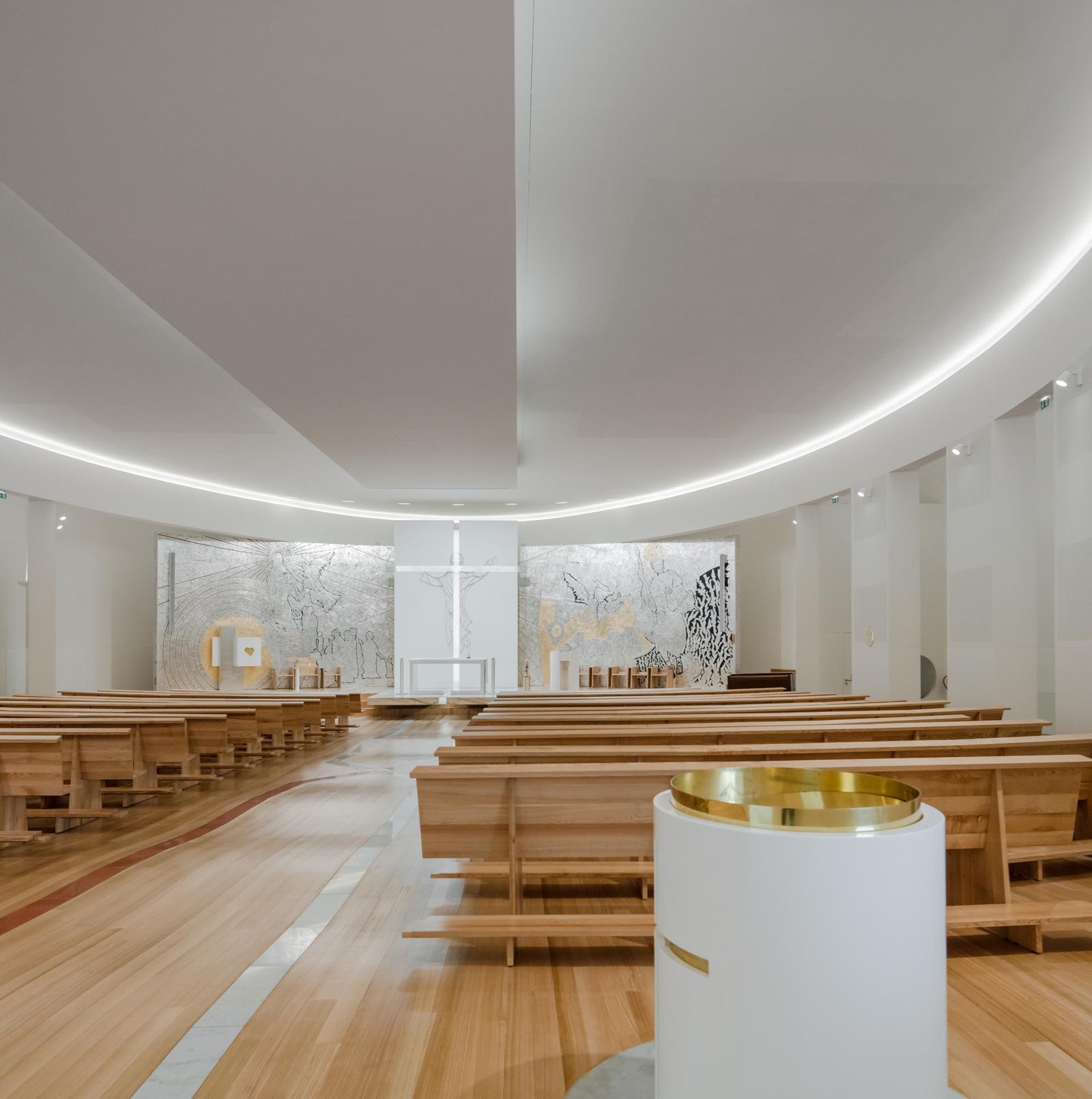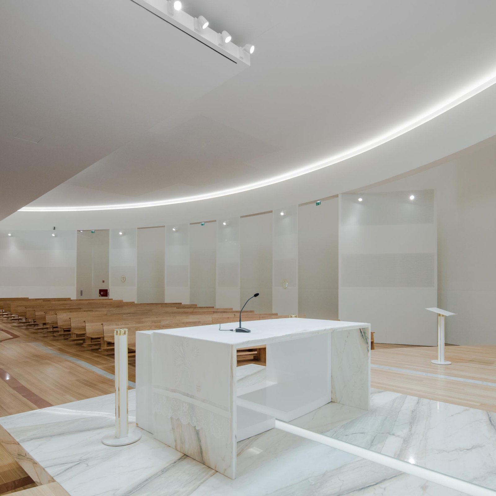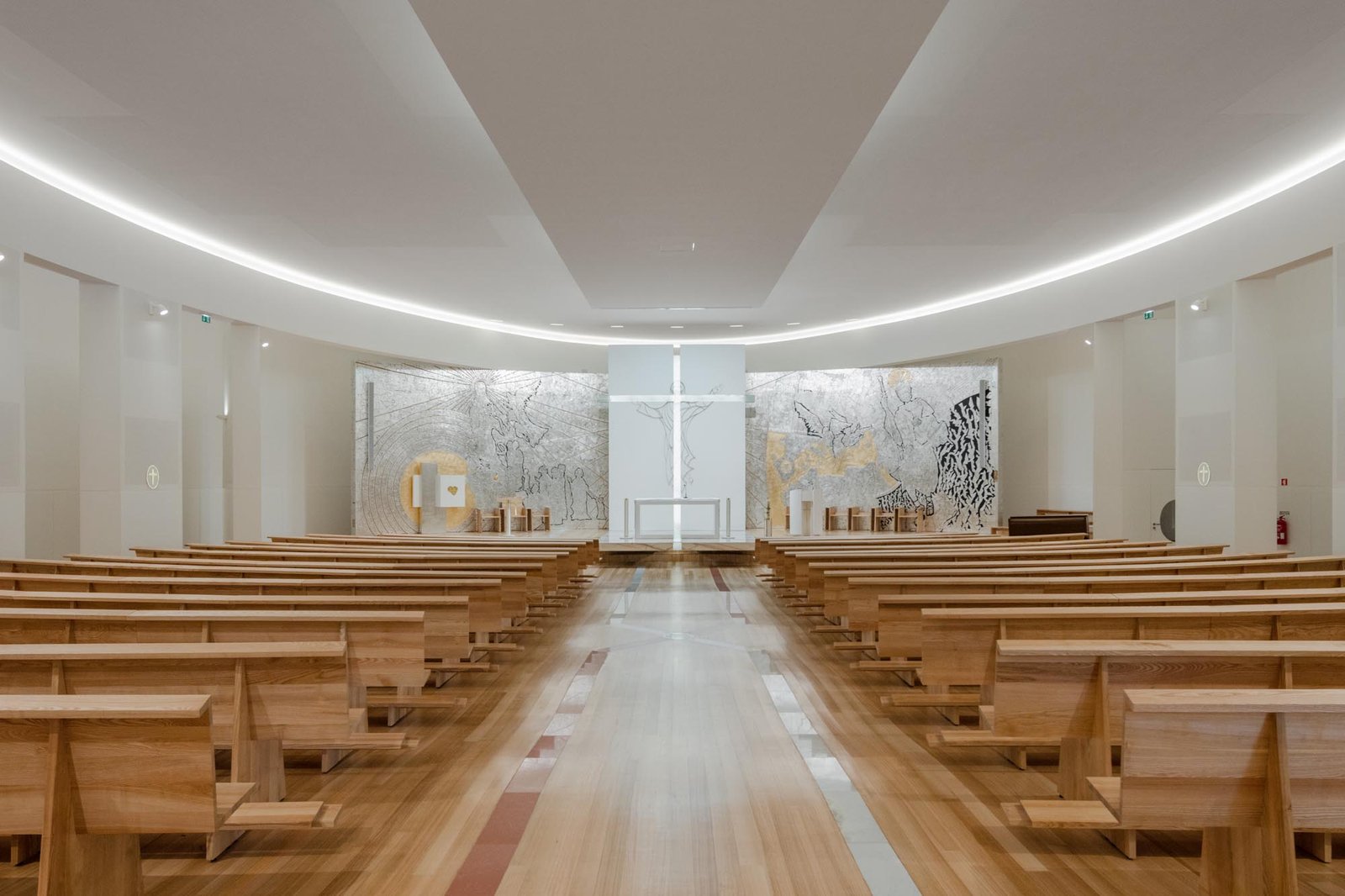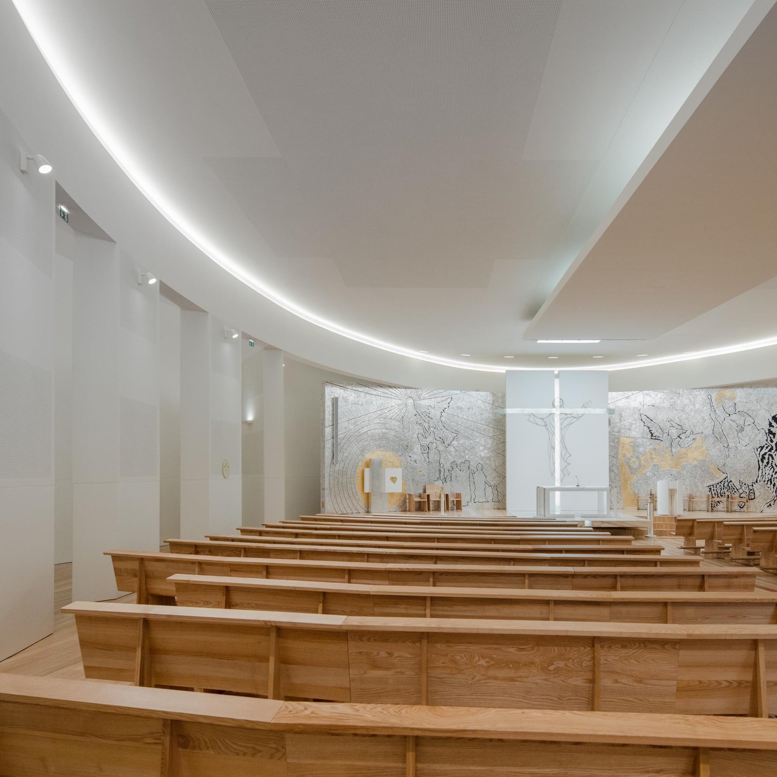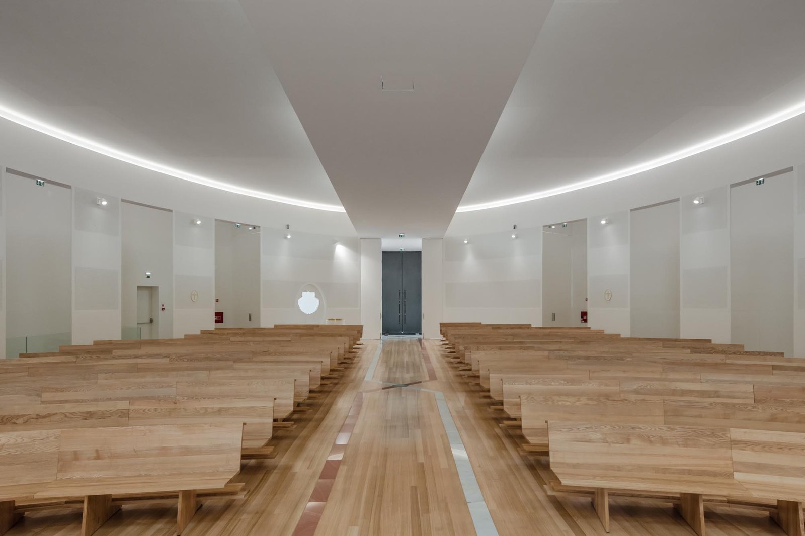 Por otro lado, las paredes interiores blancas de la nave están iluminadas por una luz difusa, creada por tragaluces ocultos que transmiten al lugar una atmósfera serena y poética que evoca la oración y la reflexión. La iluminación juega un papel importante en la intervención. Durante la noche hay un efecto de iluminación cuidadoso y articulado, tanto en el interior como en el exterior, que se desarrolló con el objetivo de realzar la iglesia.