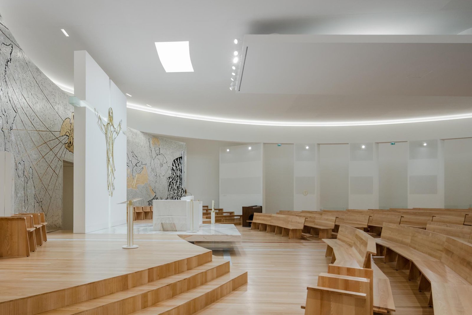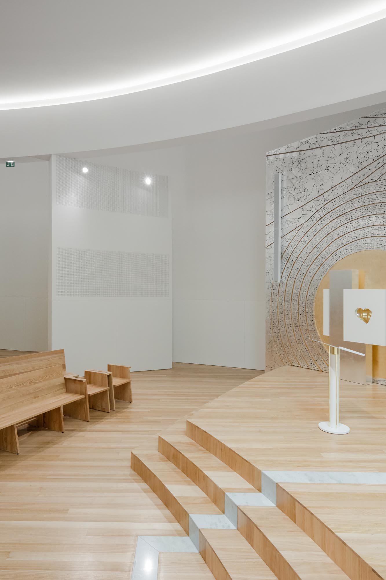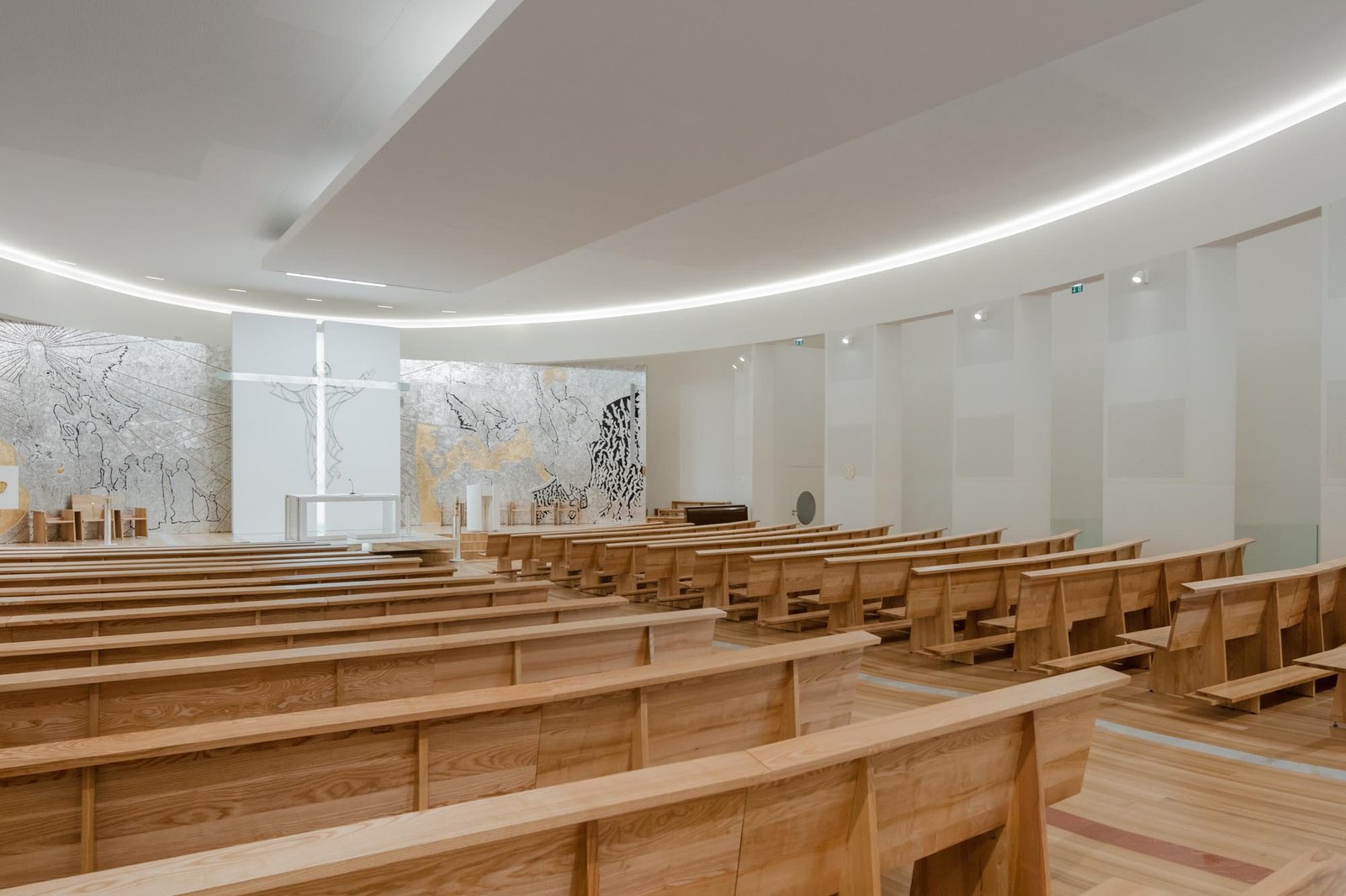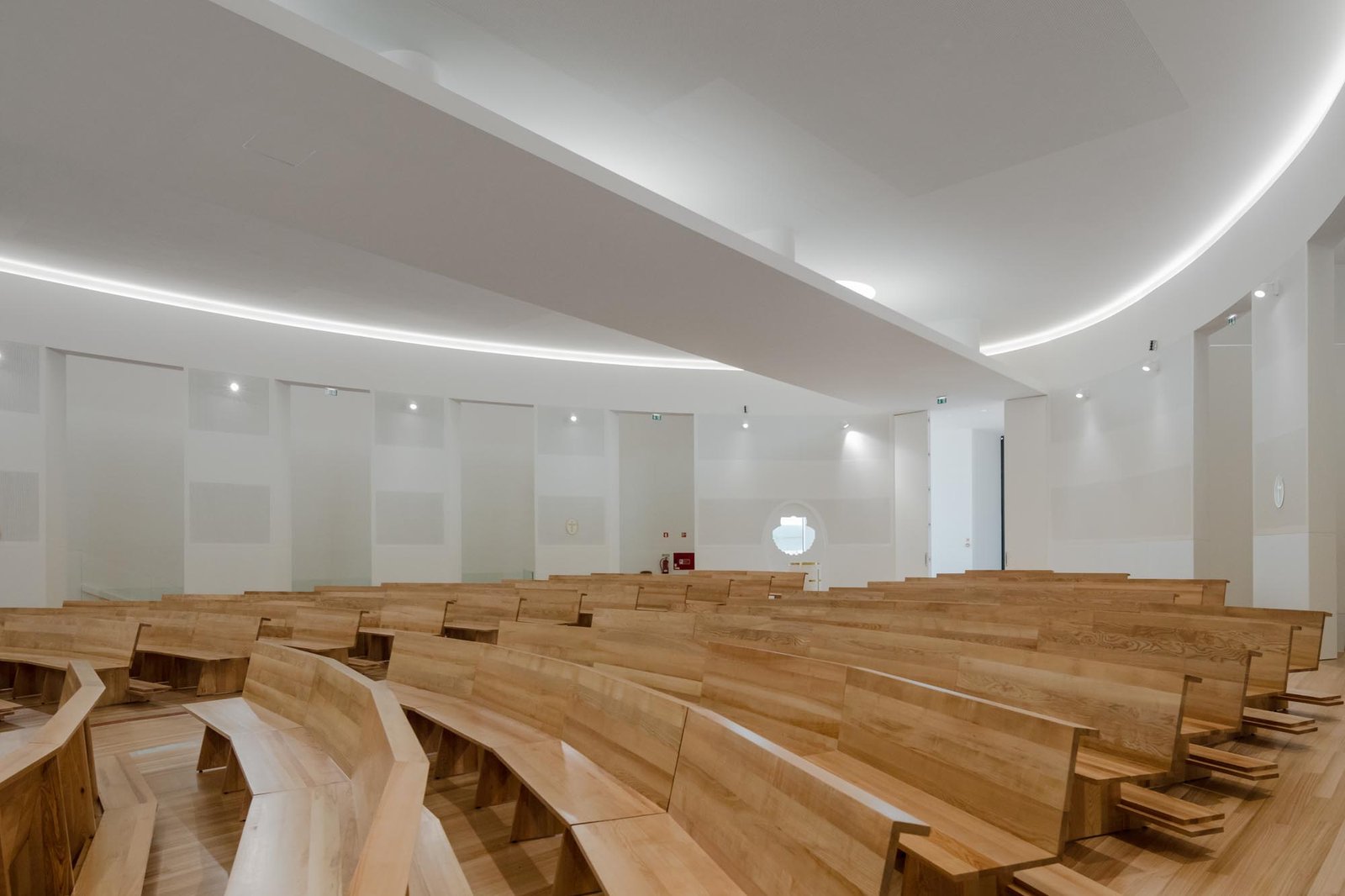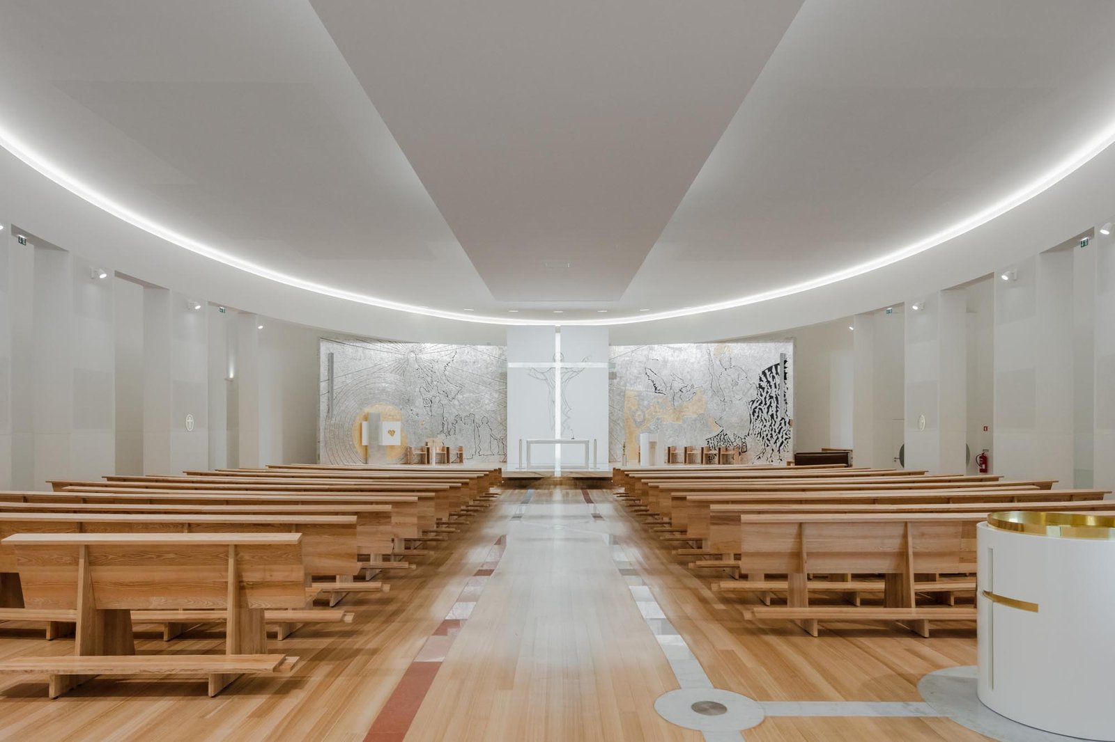 Por otro lado, las paredes interiores blancas de la nave están iluminadas por una luz difusa, creada por tragaluces ocultos que transmiten al lugar una atmósfera serena y poética que evoca la oración y la reflexión. La iluminación juega un papel importante en la intervención. Durante la noche hay un efecto de iluminación cuidadoso y articulado, tanto en el interior como en el exterior, que se desarrolló con el objetivo de realzar la iglesia.