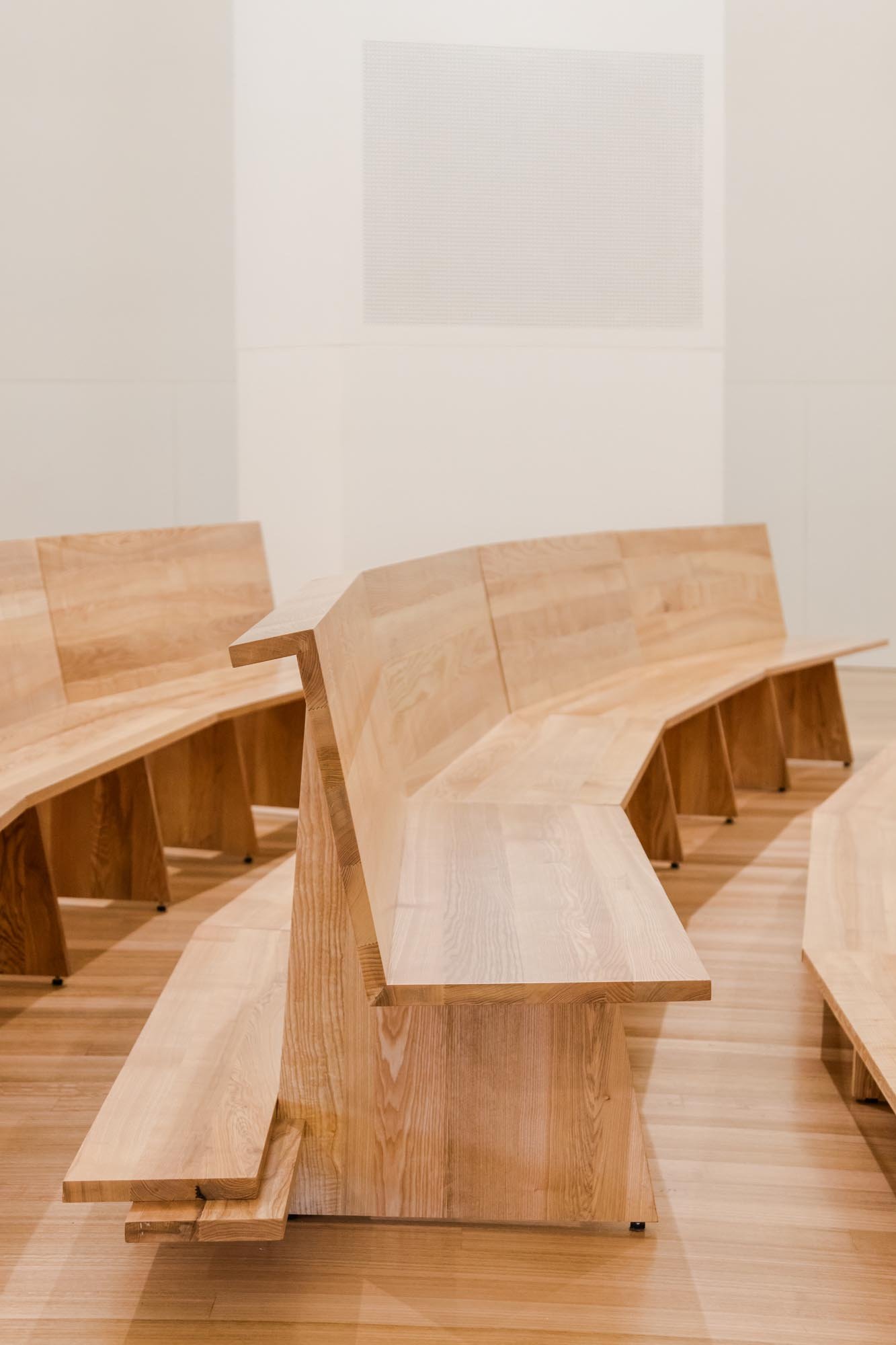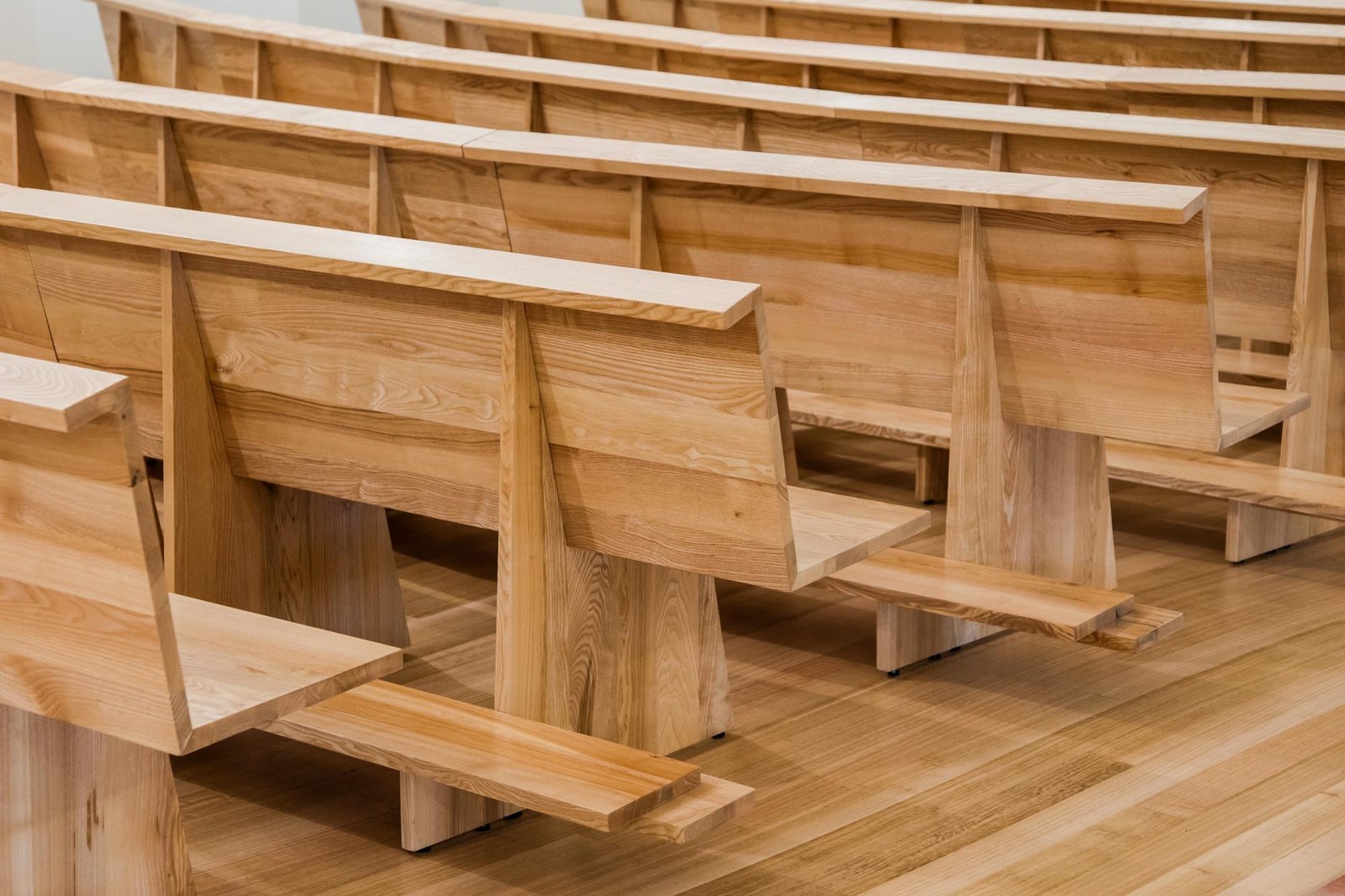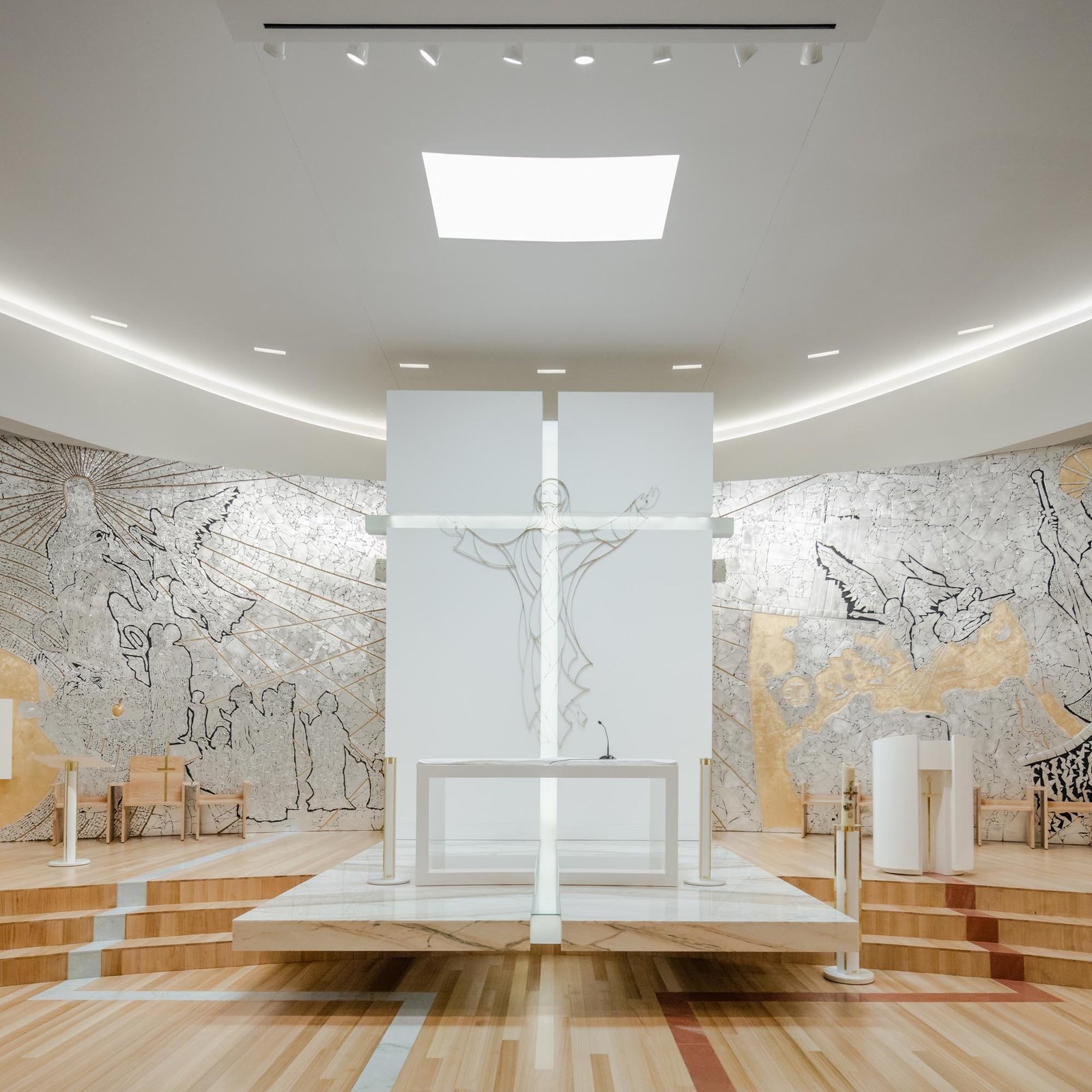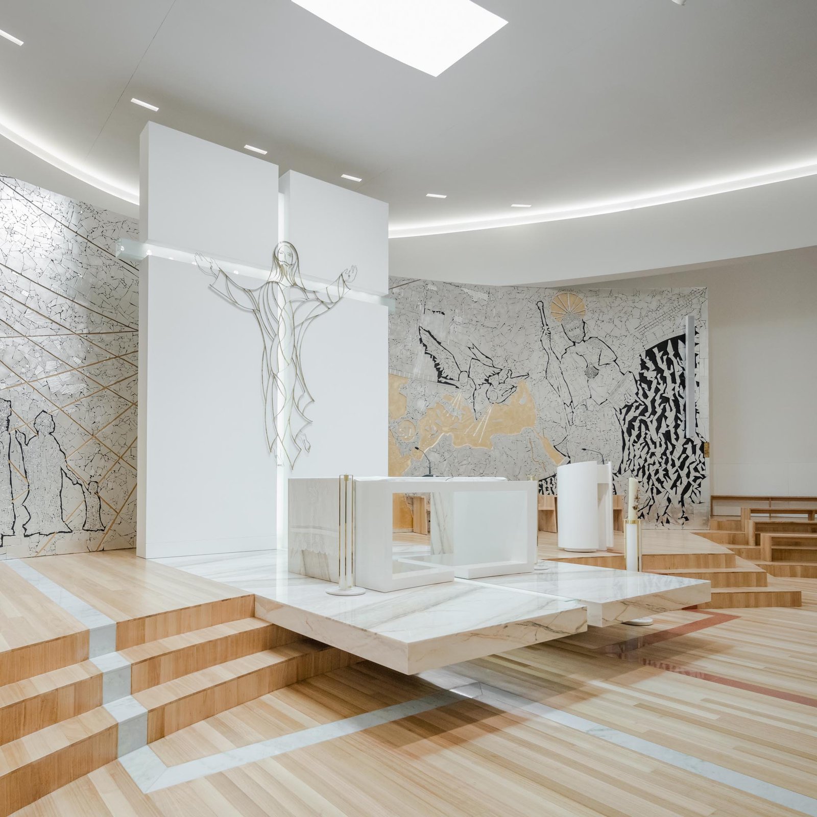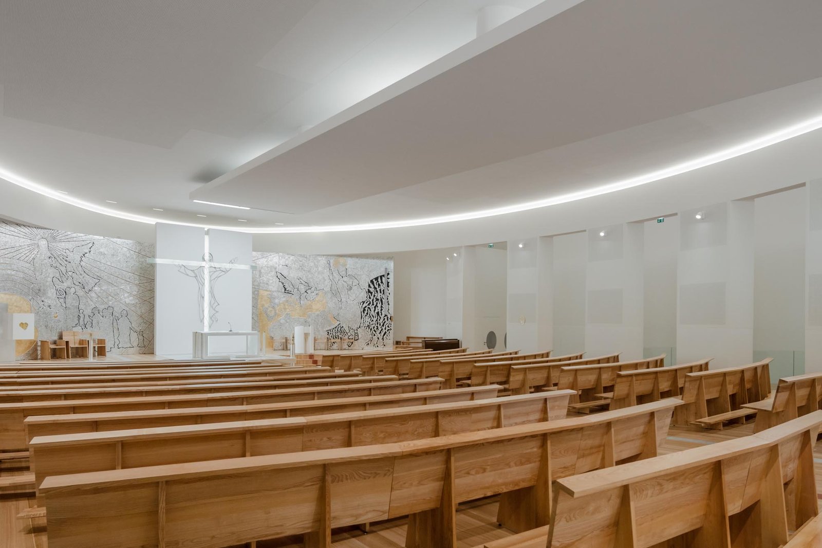 Por otro lado, las paredes interiores blancas de la nave están iluminadas por una luz difusa, creada por tragaluces ocultos que transmiten al lugar una atmósfera serena y poética que evoca la oración y la reflexión. La iluminación juega un papel importante en la intervención. Durante la noche hay un efecto de iluminación cuidadoso y articulado, tanto en el interior como en el exterior, que se desarrolló con el objetivo de realzar la iglesia.