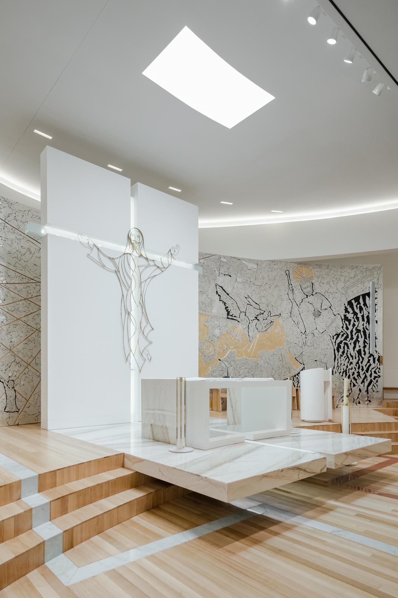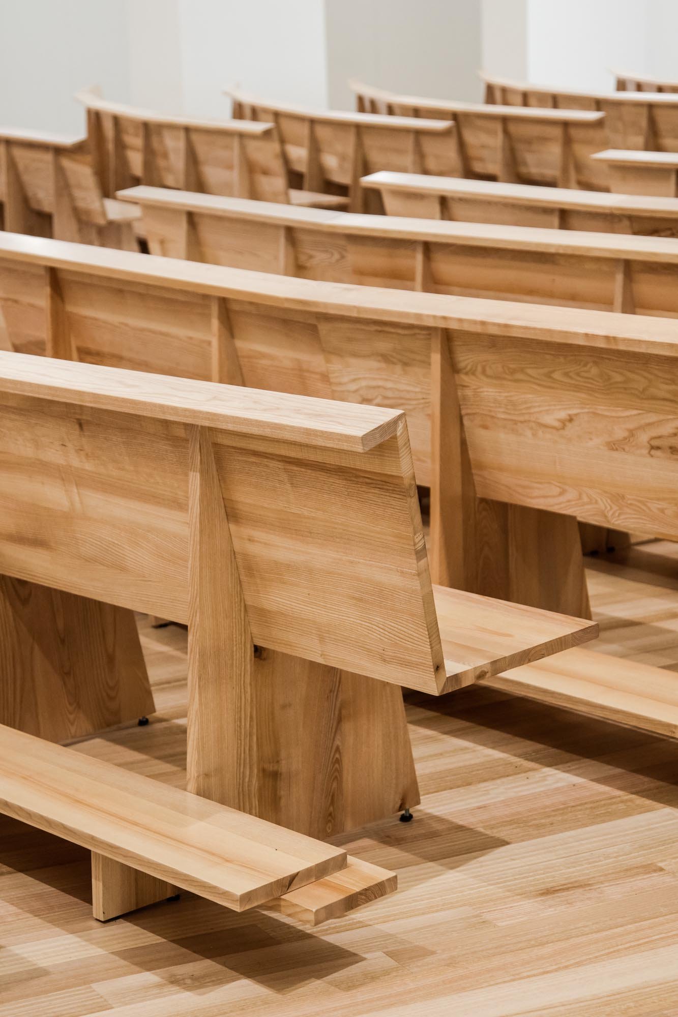 En la planta principal, nivel 0, se desarrolla el espacio para celebraciones, con capacidad para más de 500 personas. Detrás del altar se encuentran todos los puntos relacionados con el pastor y el sacristán. En la planta inferior, nivel -1, se ubican 5 espacios para catequesis, uno de los cuales tiene capacidad para acoger a unas 200 personas, y puede ser utilizado para espectáculos o conferencias.