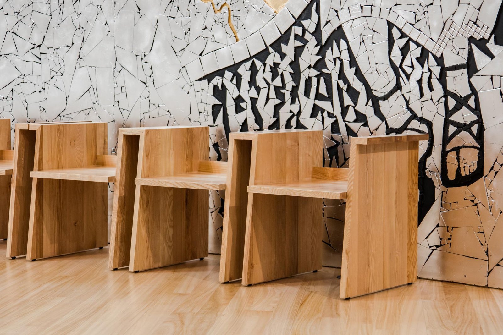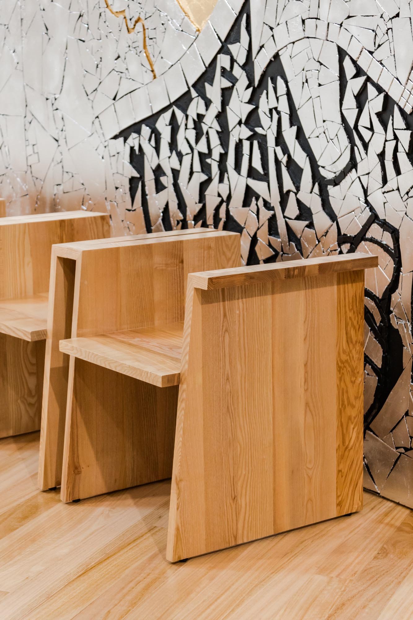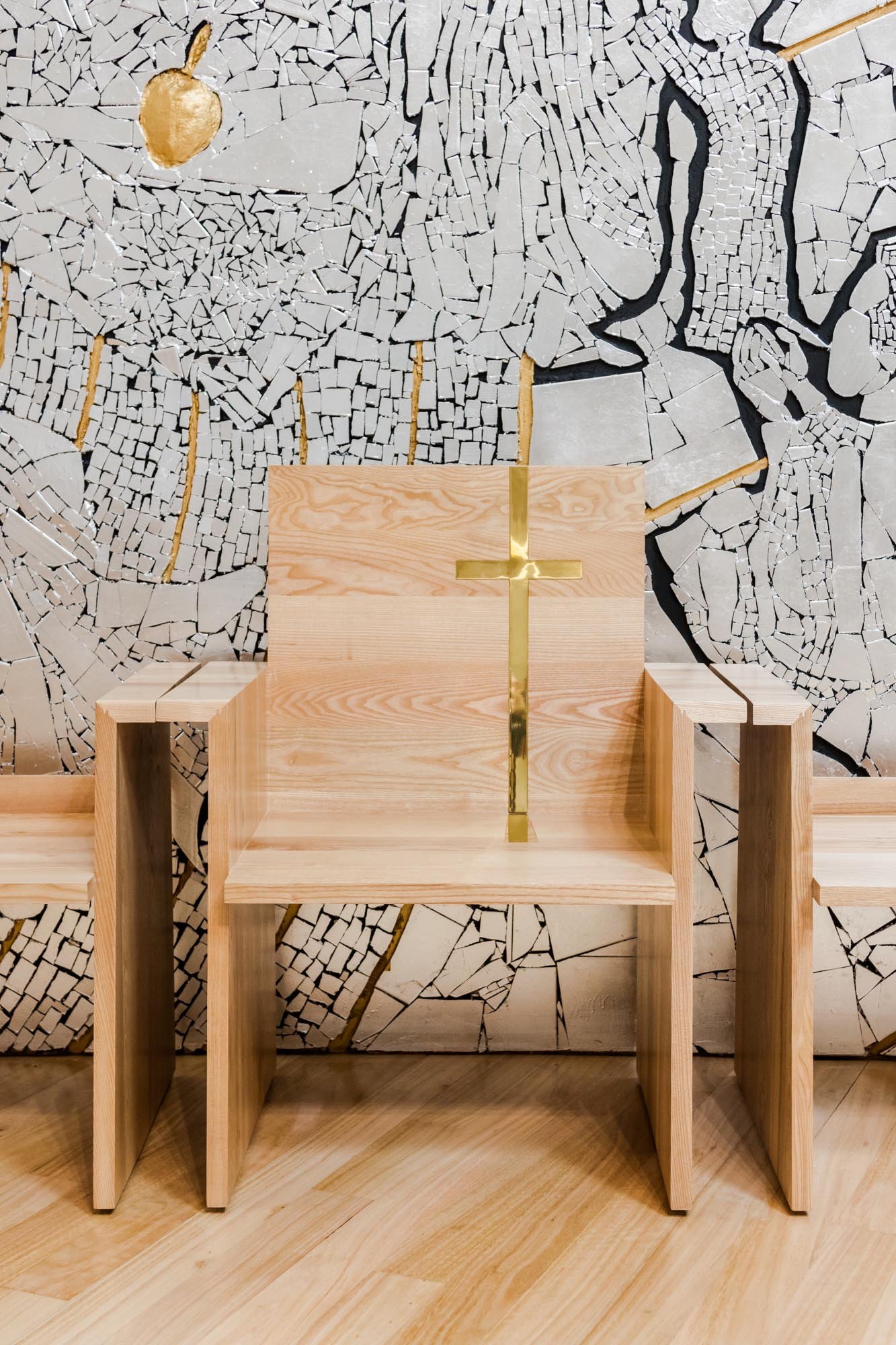 En el interior, los únicos adornos presentes se colocan en el retablo, que consiste en dos paneles construidos en cerámica y decorados con hojas de oro y plata, con imágenes de Santiago y Nuestra Señora de la Concepción. El mobiliario de madera existente fue diseñado por el equipo, específicamente para este proyecto.