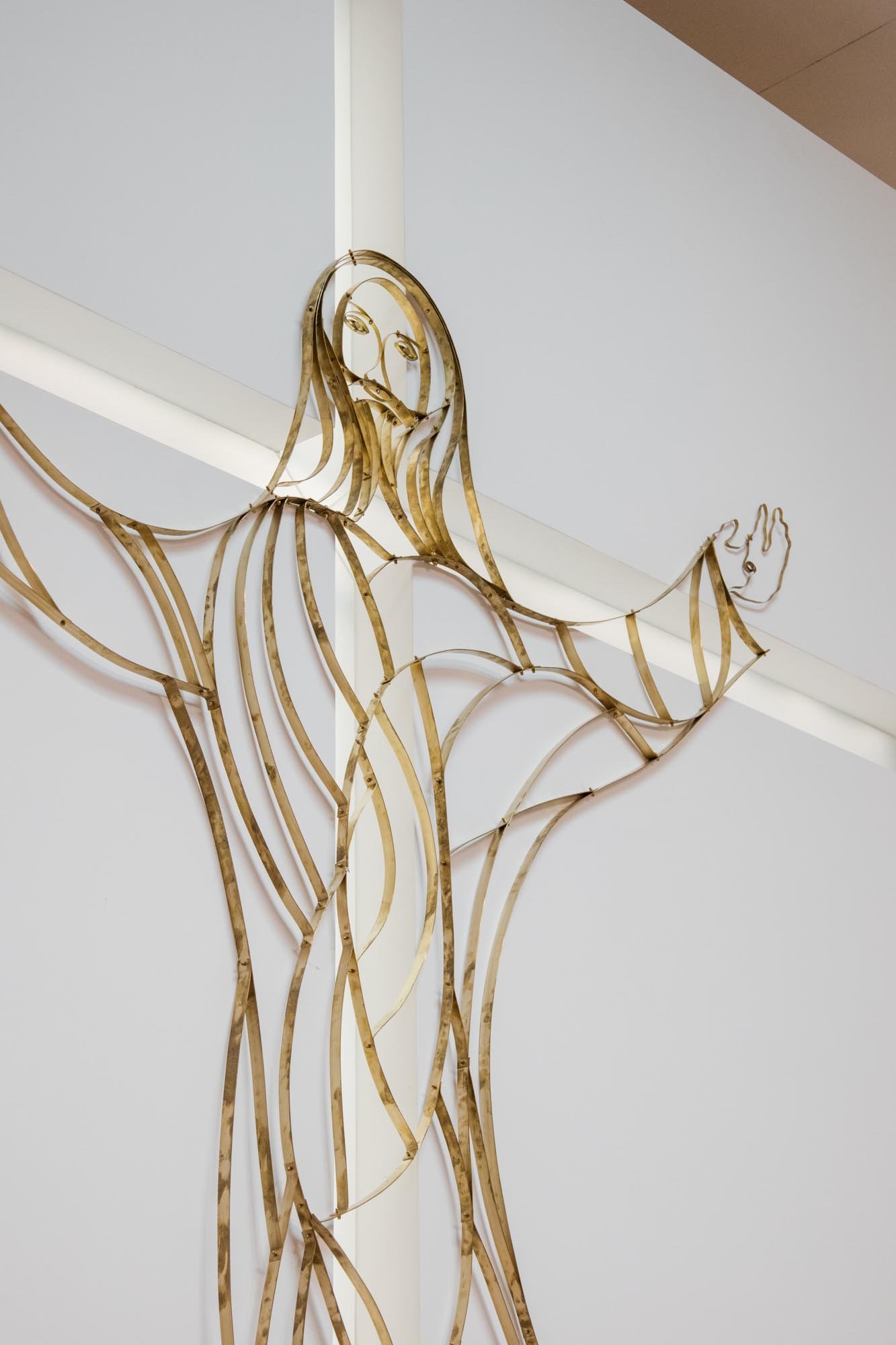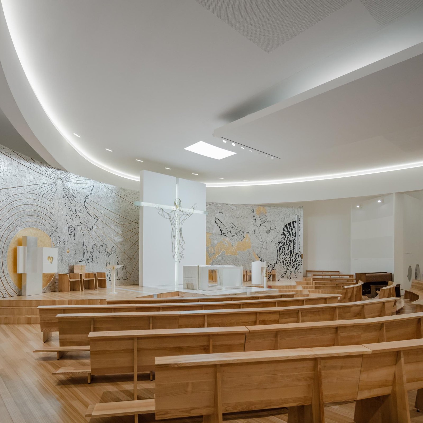 La planta de la iglesia es sencilla, sin una monumentalidad notable, y la volumetría se estudió con el objetivo de no tener un impacto visual en el paisaje. El volumen se desarrolla en dos pisos, separando claramente el espacio sagrado de los otros espacios con funciones culturales y educativas para niños y jóvenes.
