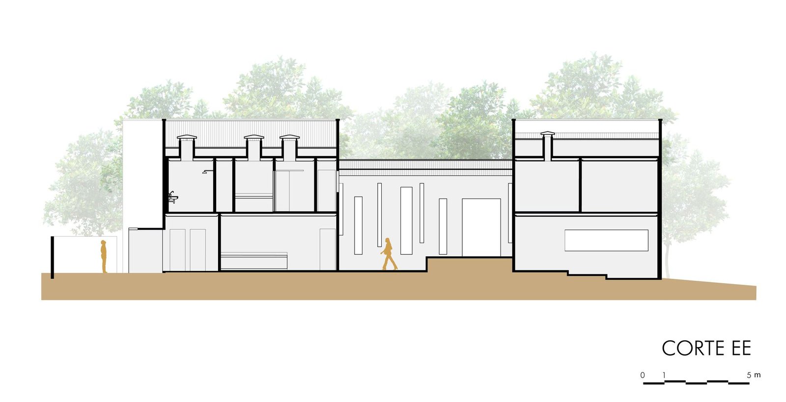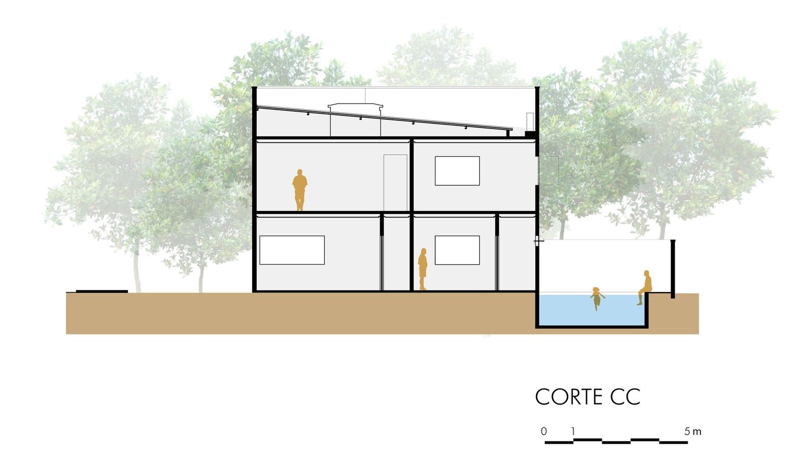 El programa se organiza en dos plantas. En la planta baja, destacan la suite de invitados, la oficina multifuncional (que también funciona como sala de cine) y la zona social, compuesta por salón, comedor y cocina, con una sutil zonificación marcada por diferentes niveles. En la planta de acceso se encuentra el salón; el comedor, ligeramente hundido, conecta directamente con la terraza y la cocina. Esta última, a su vez, cuenta con una gran ventana corredera que permite una integración total con los espacios sociales o un aislamiento completo, según se requiera.