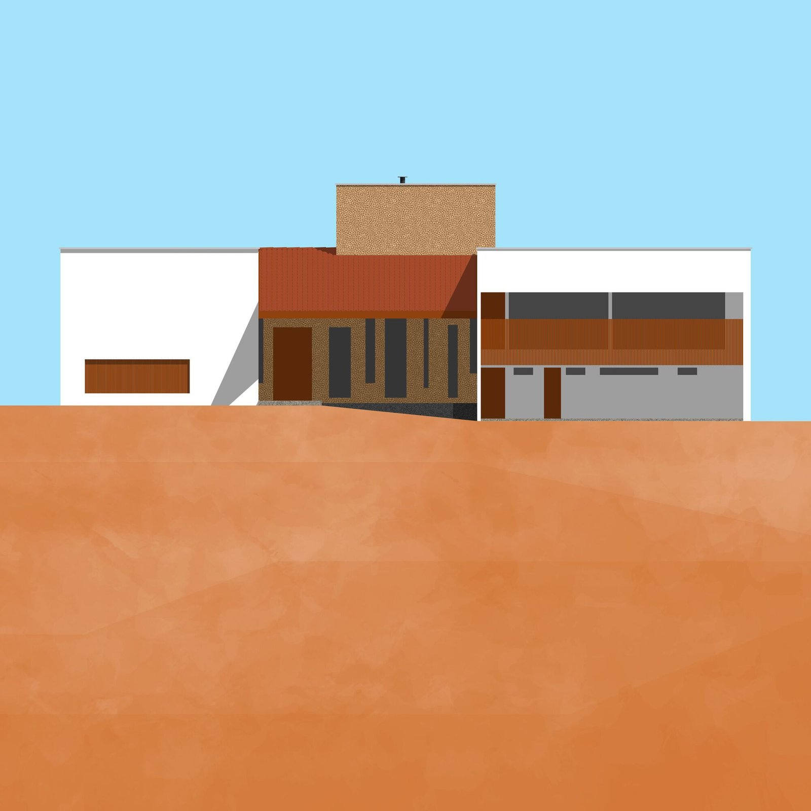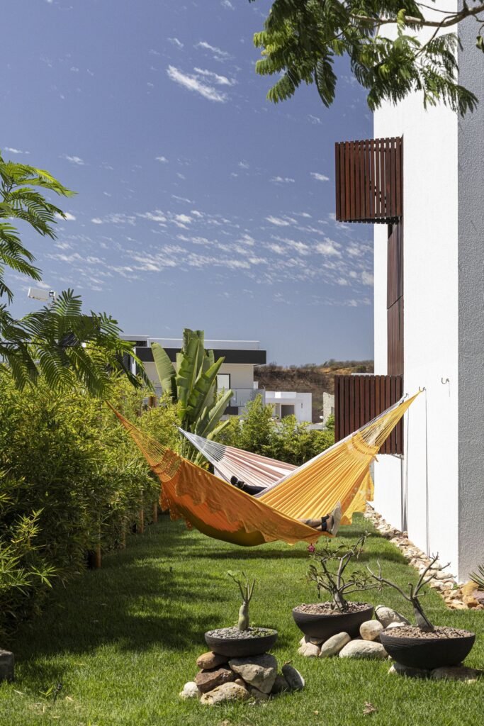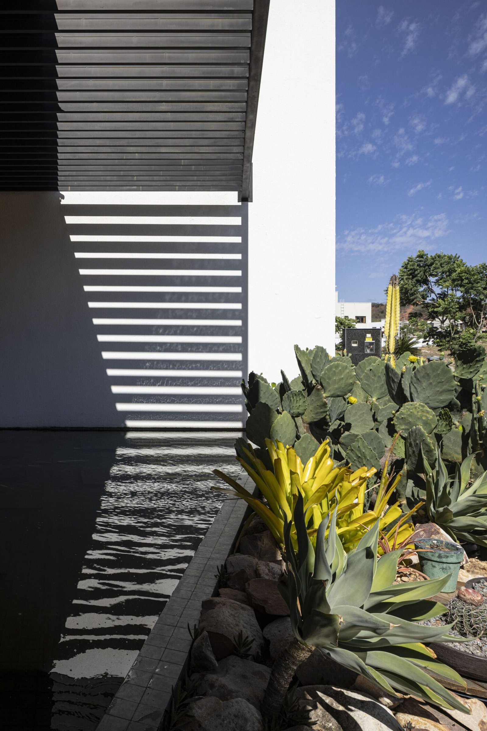 En la fachada norte, una marquesina metálica protege de la luz solar directa y señala la entrada principal, realzada por un estanque reflectante con carpas y un jardín de cactus que combina especies autóctonas y exóticas, creando un jardín de texturas y colores. Volúmenes puros, revestimiento de piedra y marcos de puertas y ventanas de diseño singular sorprenden a residentes y visitantes a cada paso.