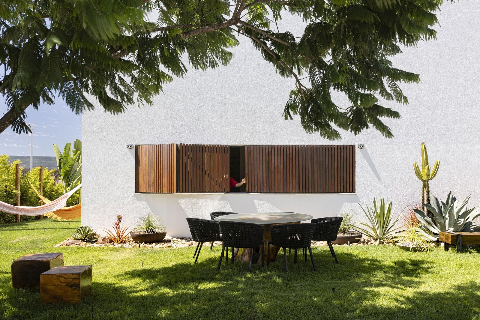 En la planta superior, las tres suites se distribuyen en dos bloques (este y oeste), conectados por un altillo con vistas al espacio diáfano del salón. Las suites infantiles dan a un amplio balcón con vistas al paisaje, mientras que la suite principal, orientada al sur, ofrece vistas del horizonte y del perfil de la Chapada do Araripe.