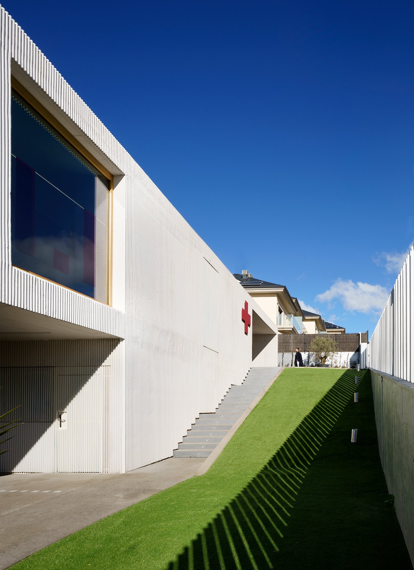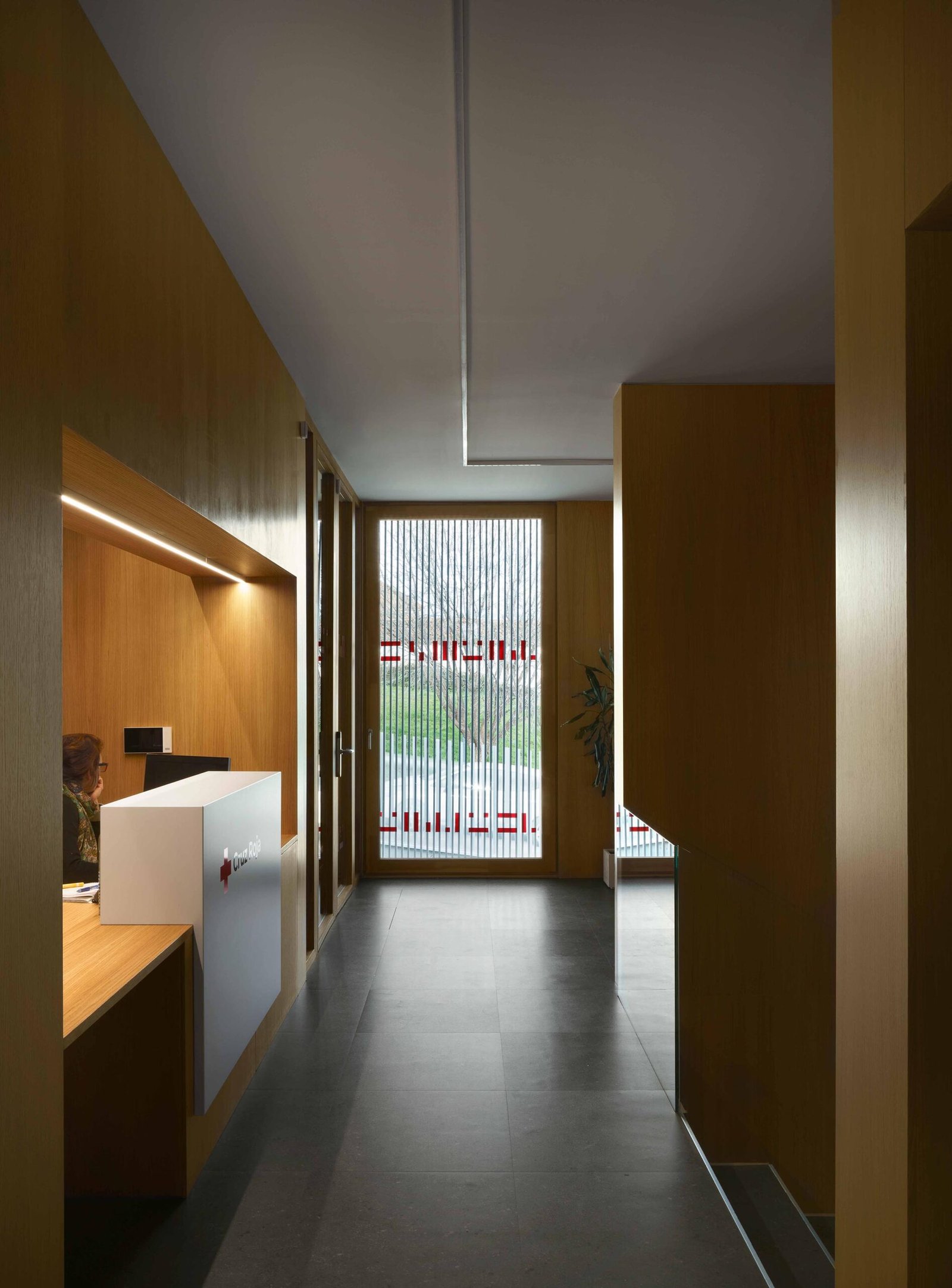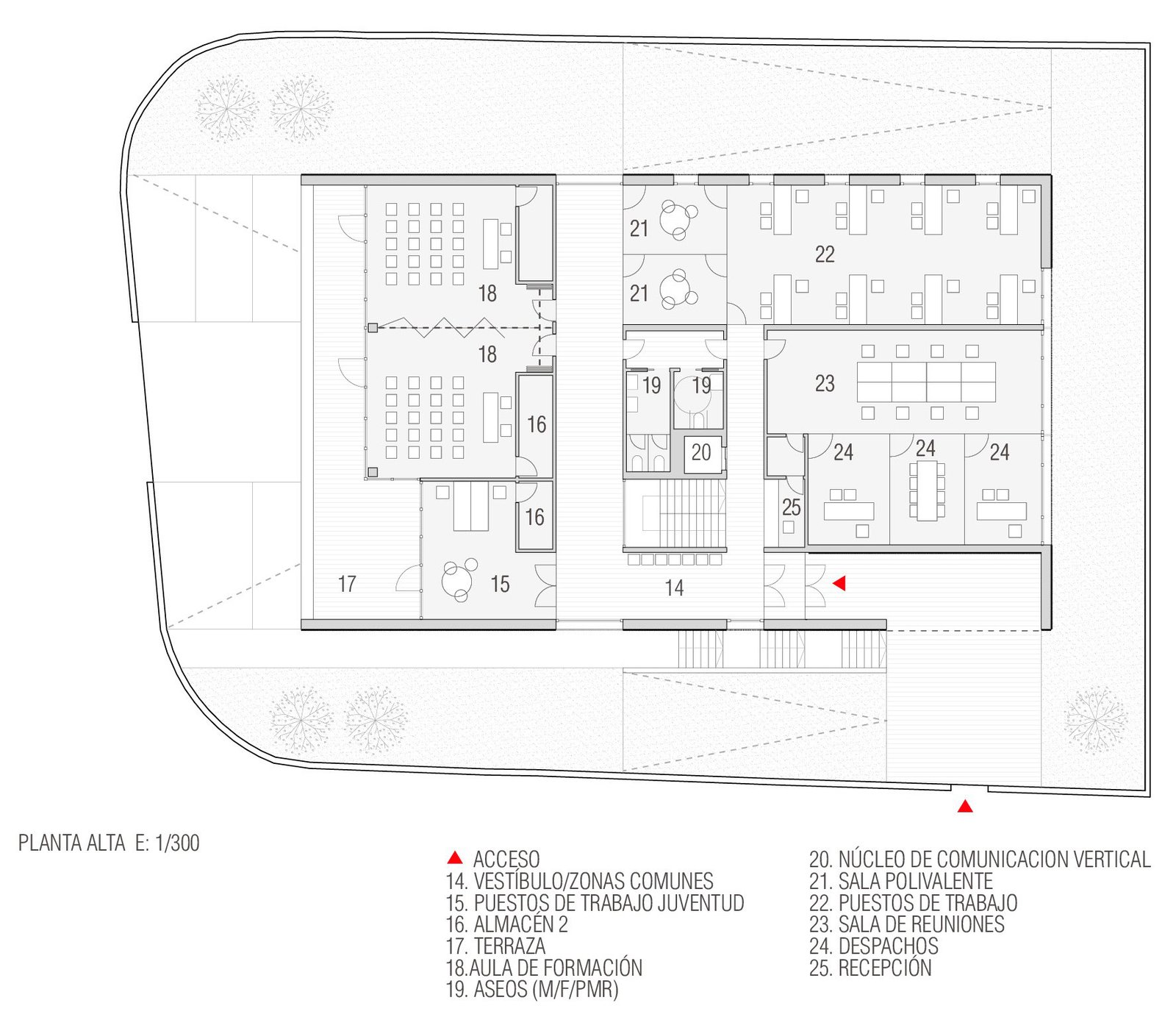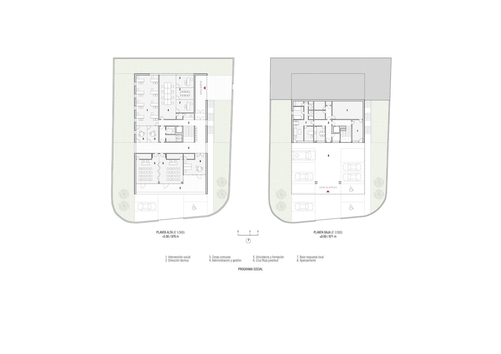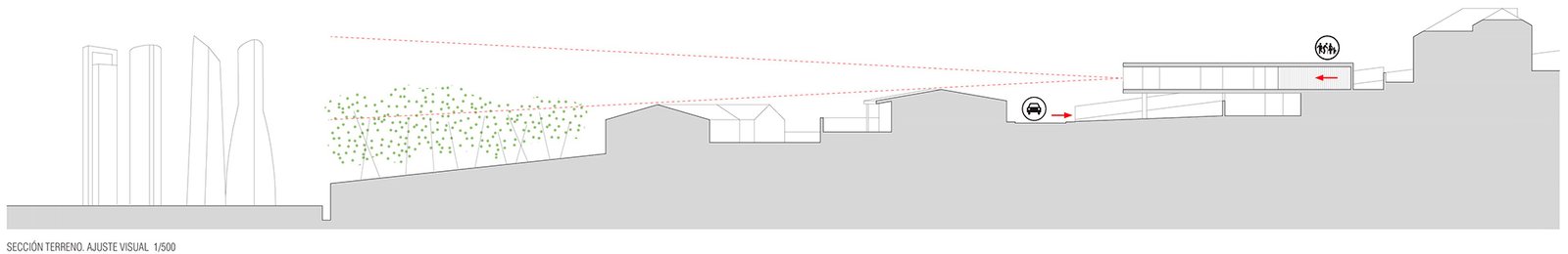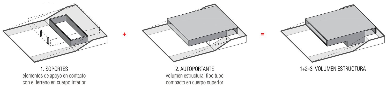 Así, el edificio cuenta con dos accesos diferenciados, uno para vehículos en el nivel inferior y otro peatonal en el superior, donde se desarrolla la mayor parte del programa público.