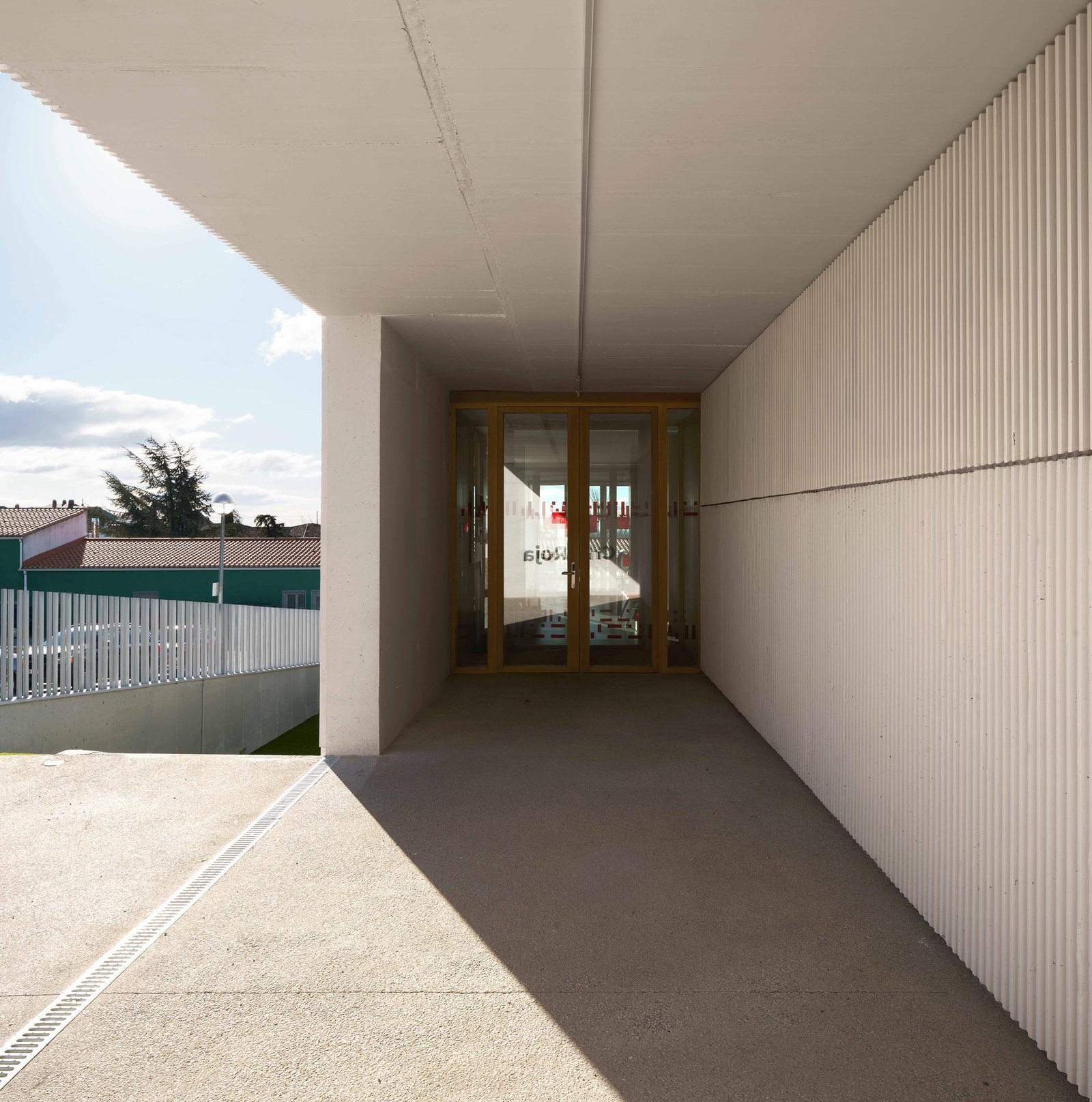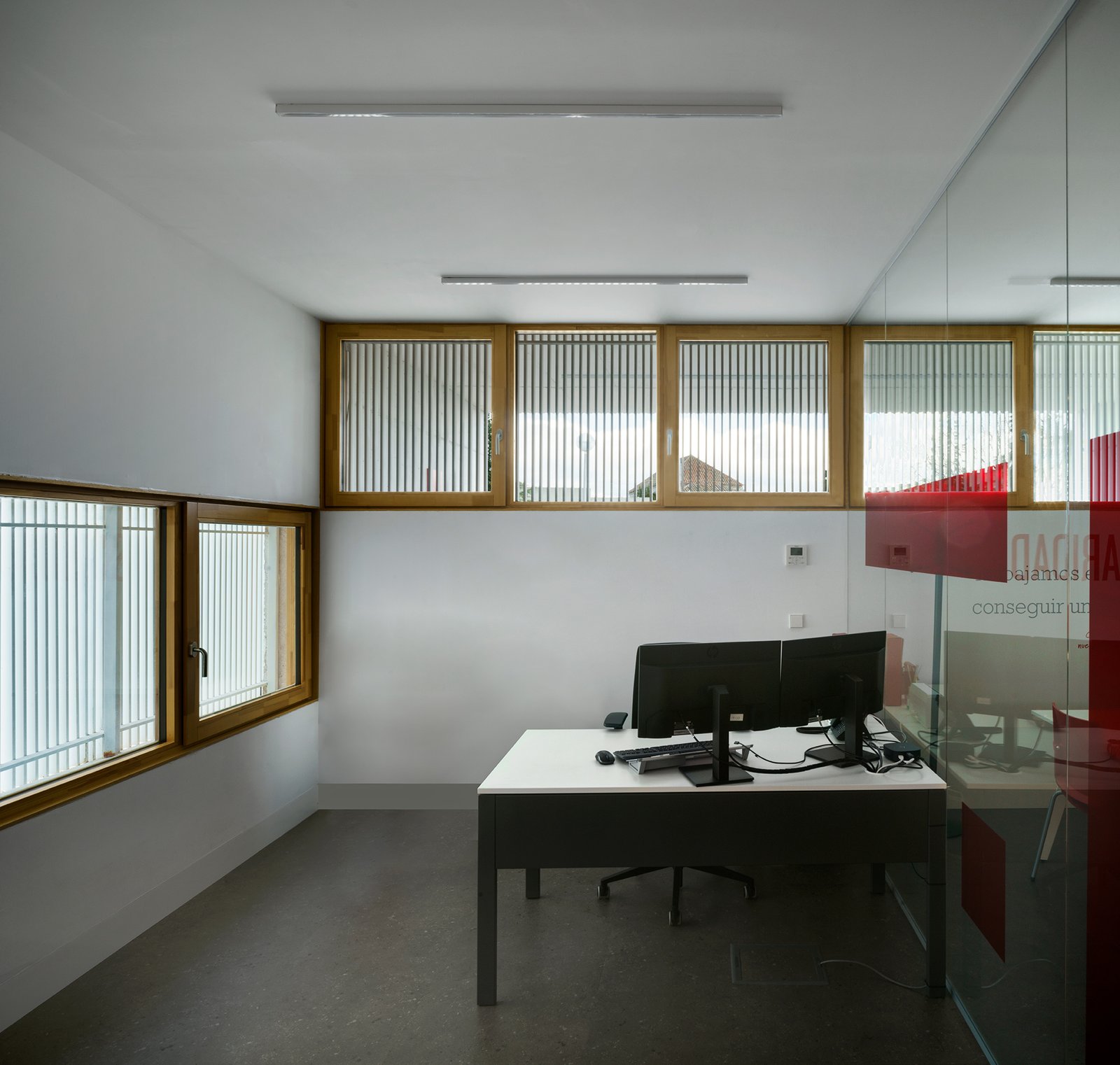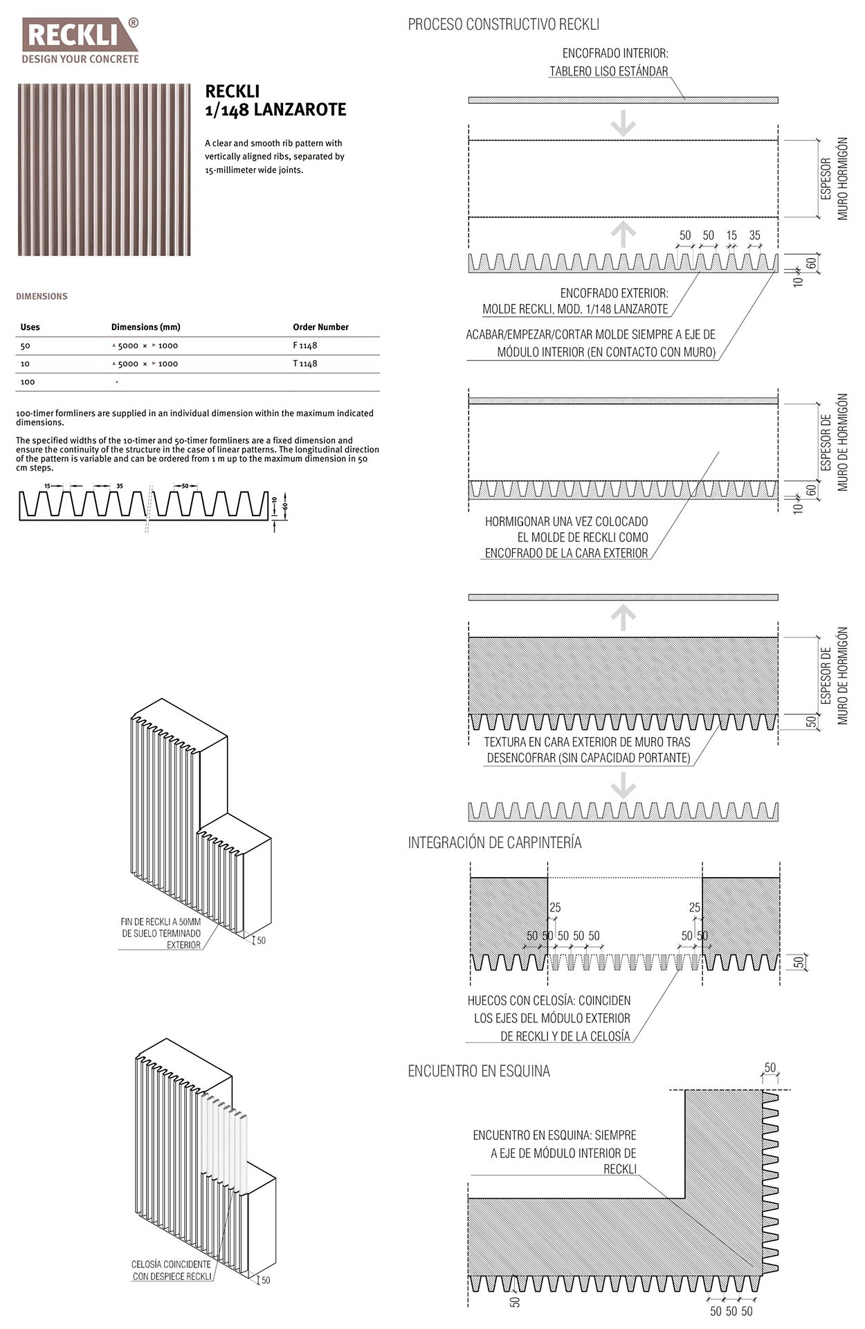 La estructura se resuelve con muros y losas de hormigón blanco, empleando un molde de poliuretano por la cara exterior en forma de estrías o nervios verticales, que permite la integración de la cerrajería que protege los huecos mediante perfiles de aluminio de la misma sección y ritmo, a modo de celosías. El volumen se comporta como un tubo estructural continuo, apoyado sobre dos únicos pilares, generando amplios voladizos.