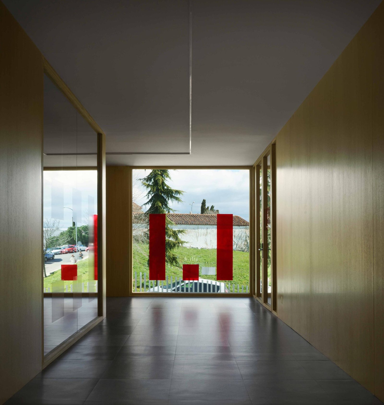Esta estructura a modo de tubo, que también es cerramiento, se abre al sur a través de una terraza que ocupa todo el frente y resuelve su fachada retranqueada mediante carpinterías de madera y vidrio de suelo a techo para permitir, simultáneamente, magníficas vistas y el control solar necesario. Así, la terraza integrada en el edificio forma parte del paisaje exterior y permite realizar actividades al aire libre en continuidad con los espacios interiores.