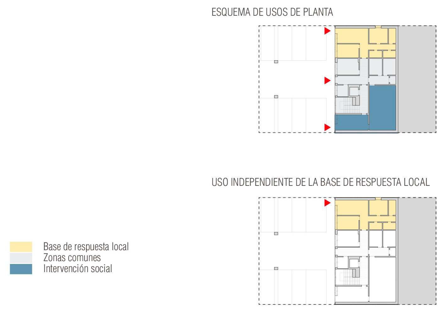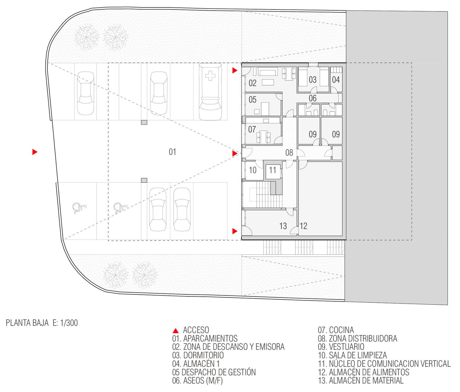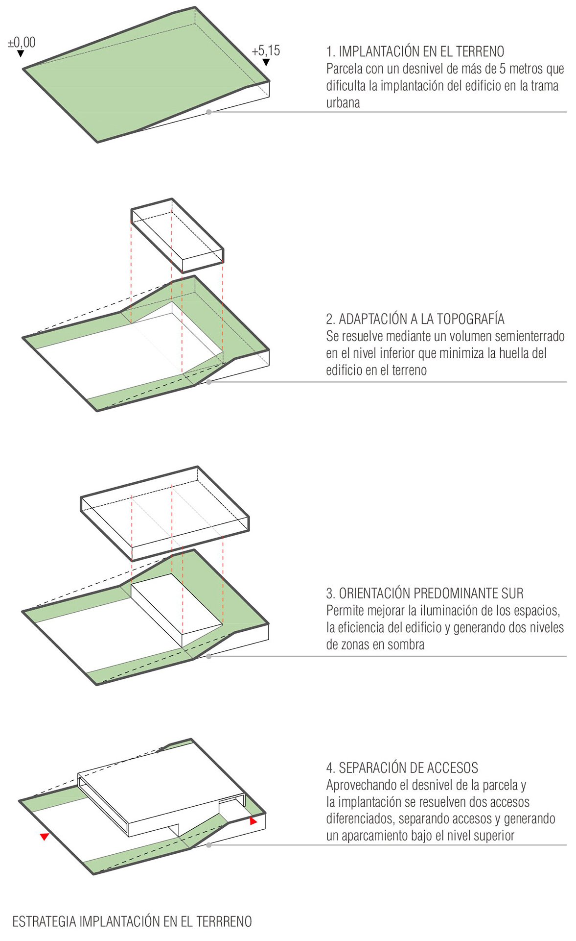 De esta manera, evitamos la construcción de un sótano, con el consiguiente ahorro económico, al mismo tiempo que mejoramos el comportamiento del edificio, reduciendo la huella de contacto con el terreno.