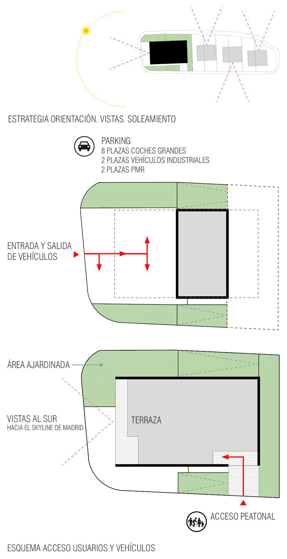 Esta situación proporciona frentes a tres calles con una clara orientación norte-sur en su eje longitudinal, por lo que resulta conveniente orientar el edificio en esa dirección para responder, además de a las condiciones urbanas, mostrando su vocación pública, a las condiciones de soleamiento y hacia la visión lejana de la silueta de Madrid, con sus cuatro torres al fondo.