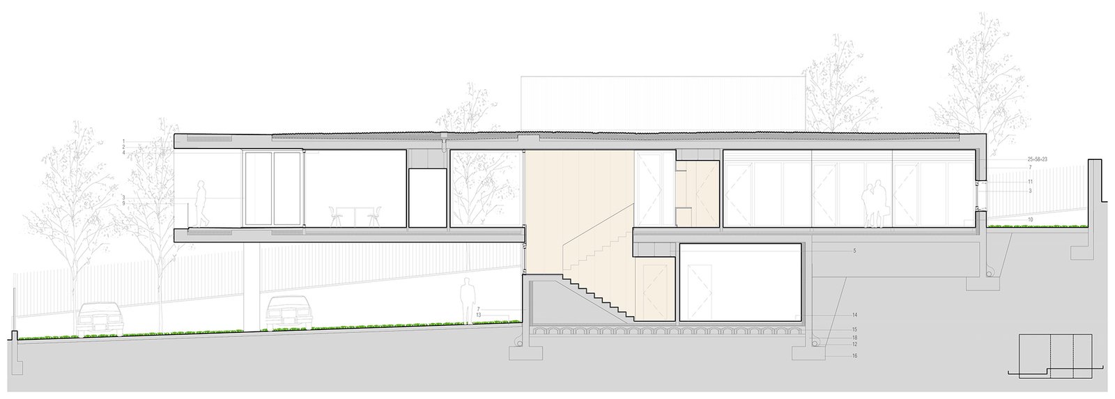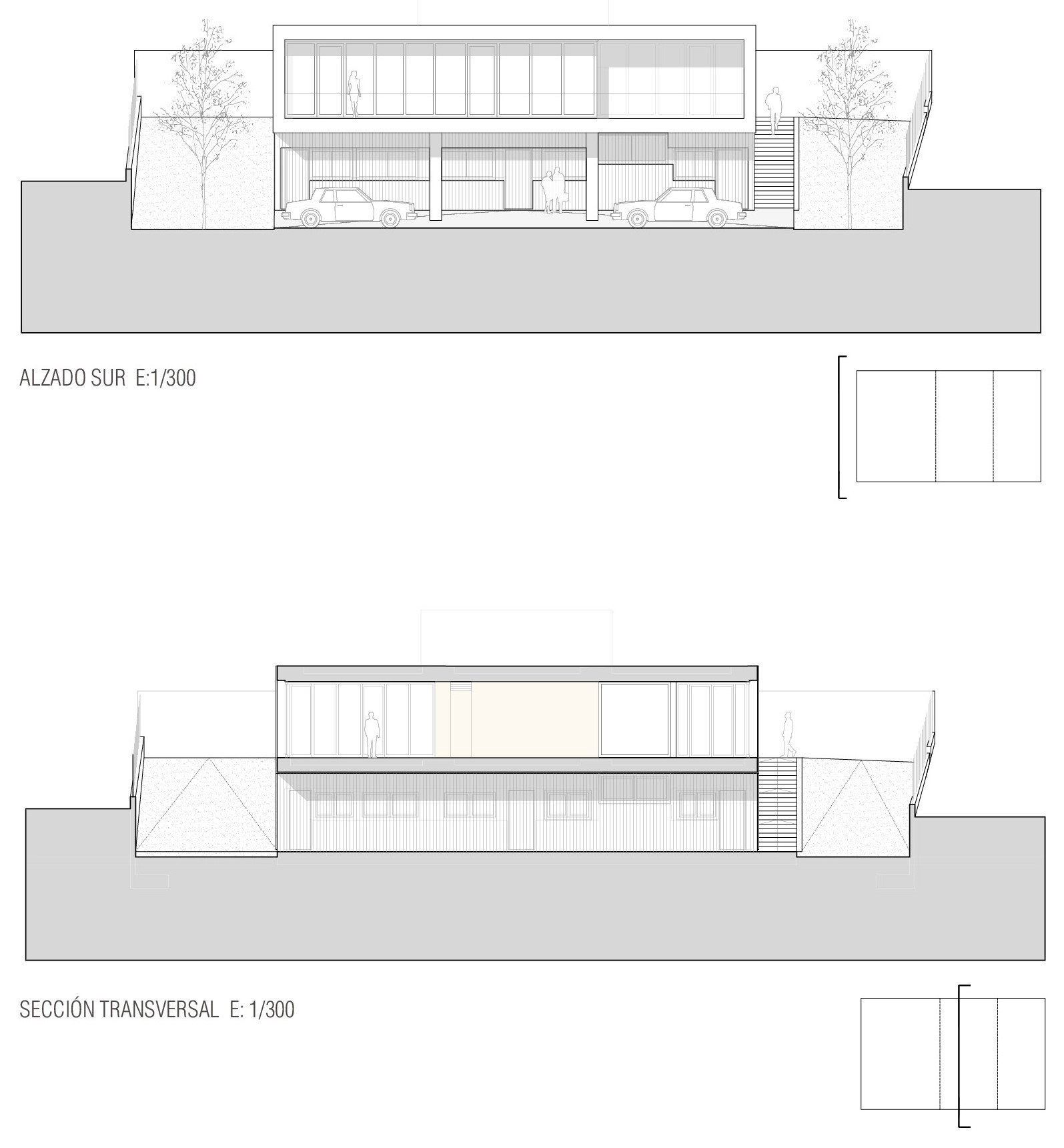 Esta orientación permite, además, aprovechar de manera natural la pendiente de la parcela para organizar el programa en dos niveles y resolver el aparcamiento bajo el nivel superior.