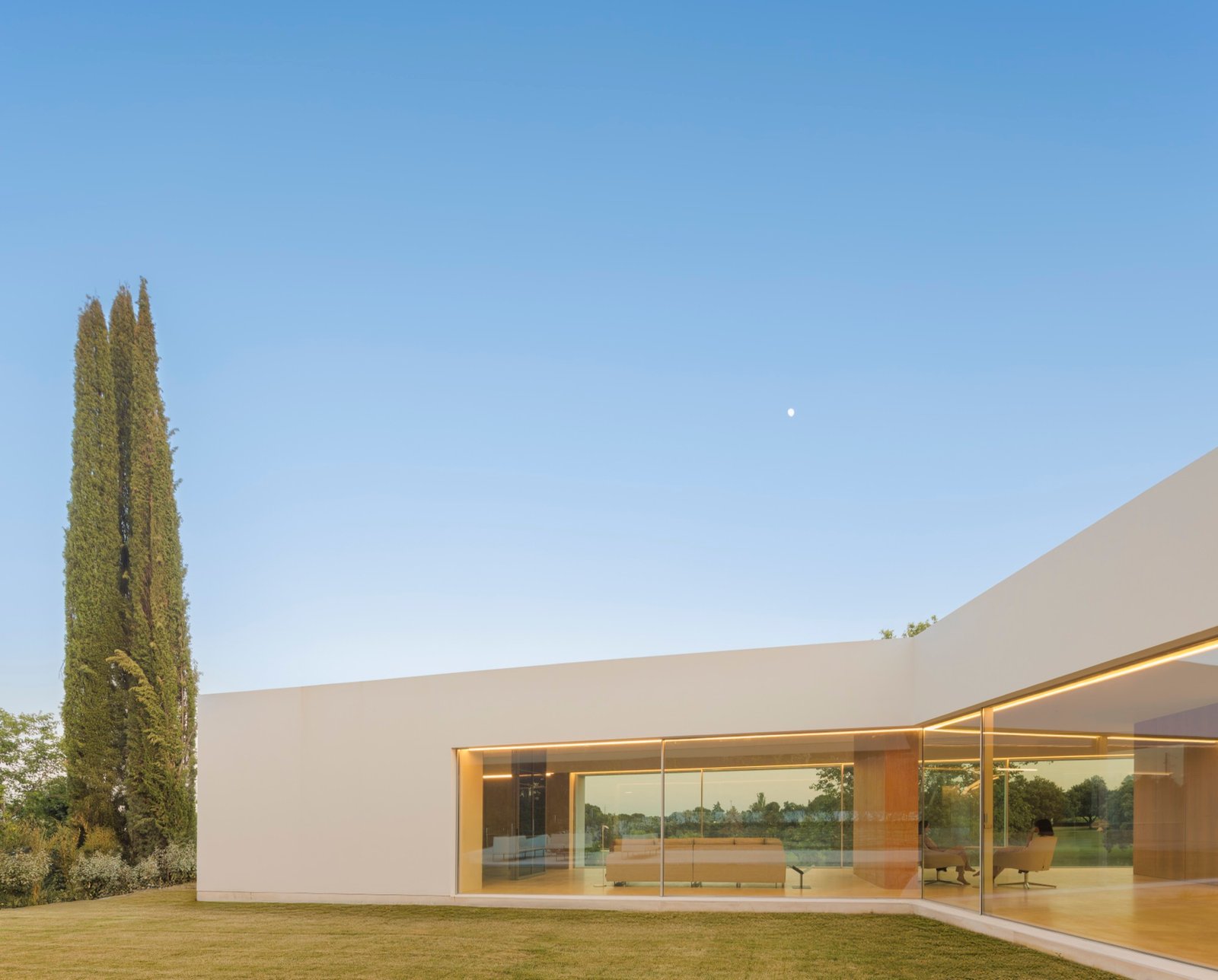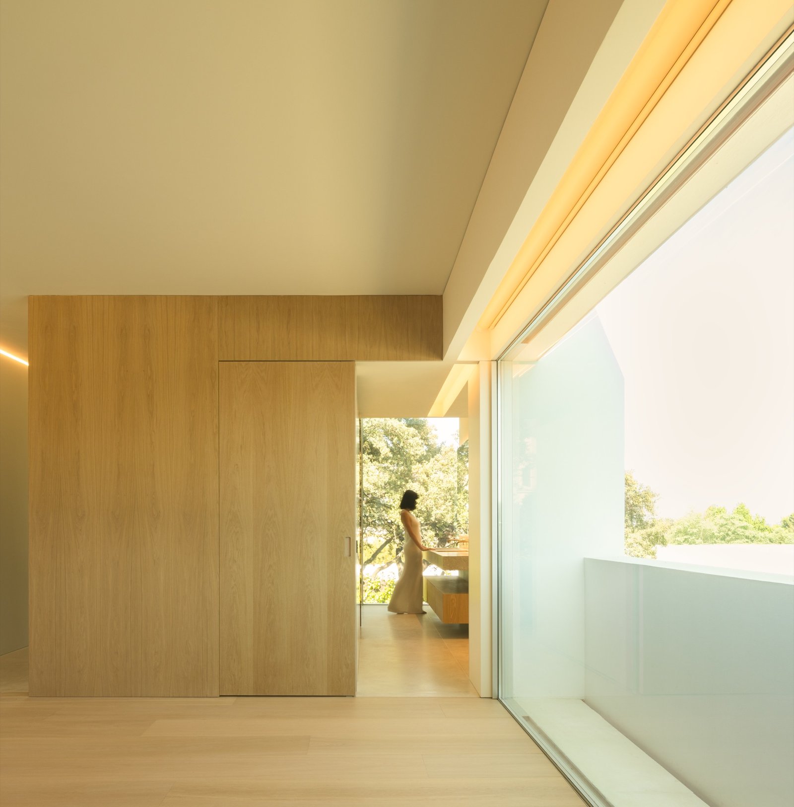 El programa se organiza siguiendo esta lógica ascendente. En el nivel inferior se sitúan la piscina y las habitaciones de invitados; por encima se desarrolla la zona de día, que se orienta hacia la cercana vista de un lago; y en la cota más alta se disponen las estancias nocturnas, reunidas en una pieza que actúa como un puente y genera bajo ella una amplia terraza en sombra.