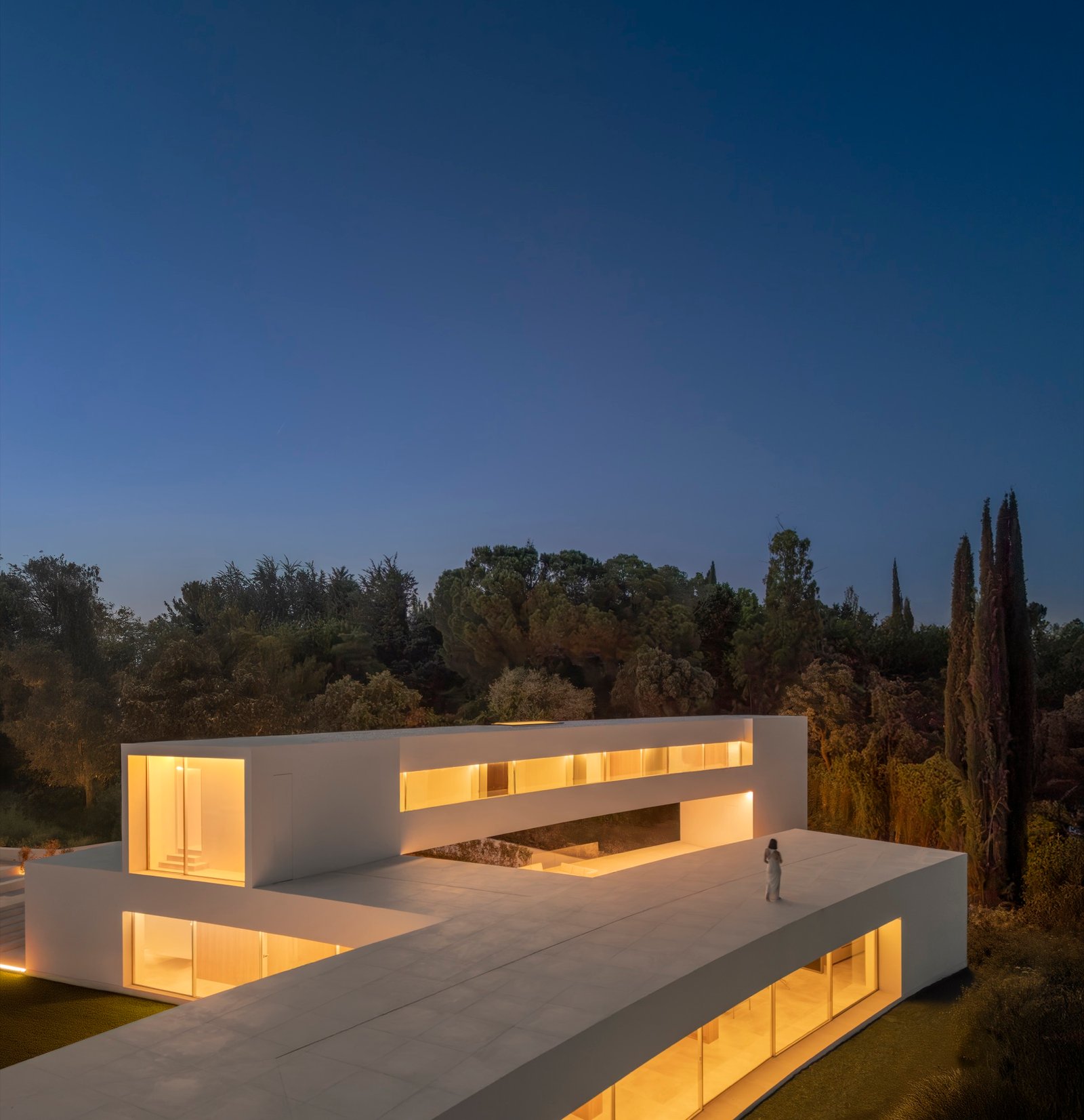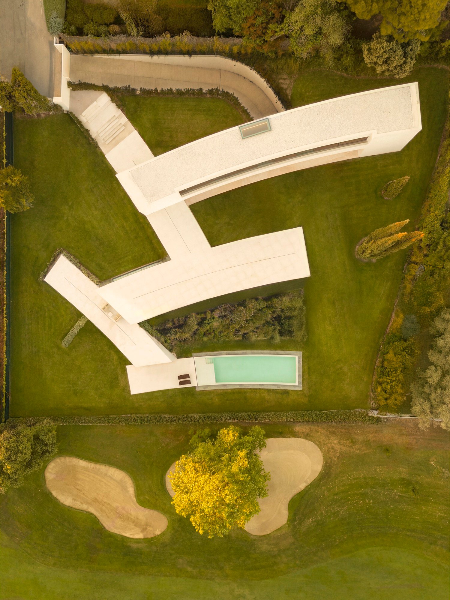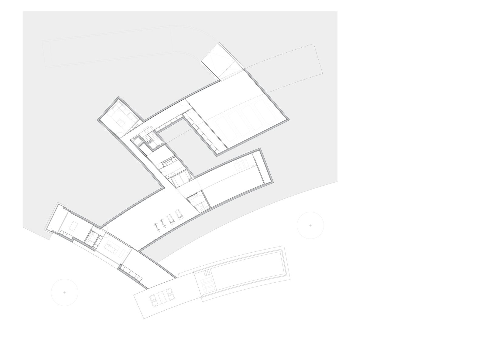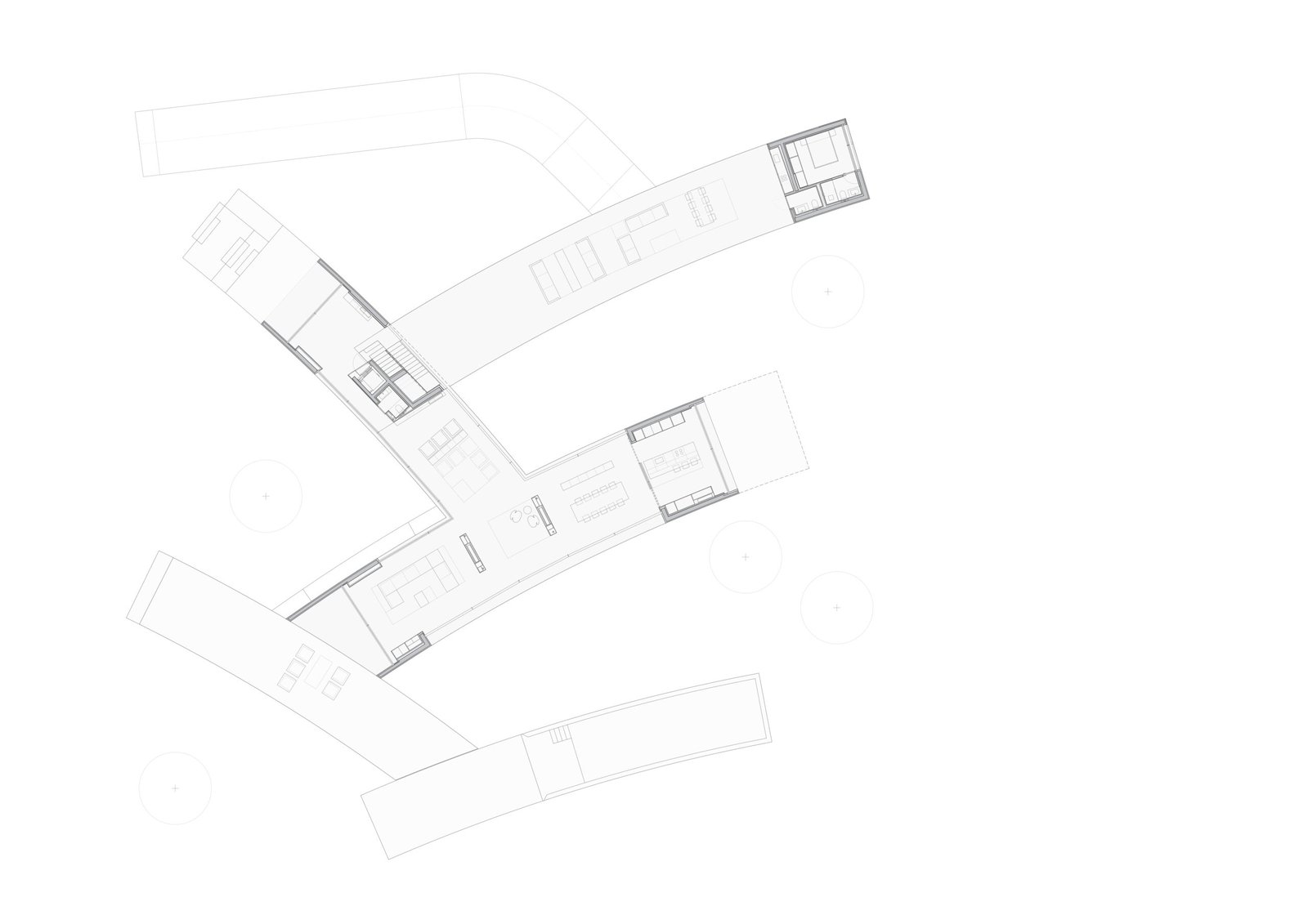 En el punto donde convergen las distintas piezas se ubica el núcleo de comunicaciones, que articula los niveles y refuerza la continuidad entre arquitectura y paisaje.