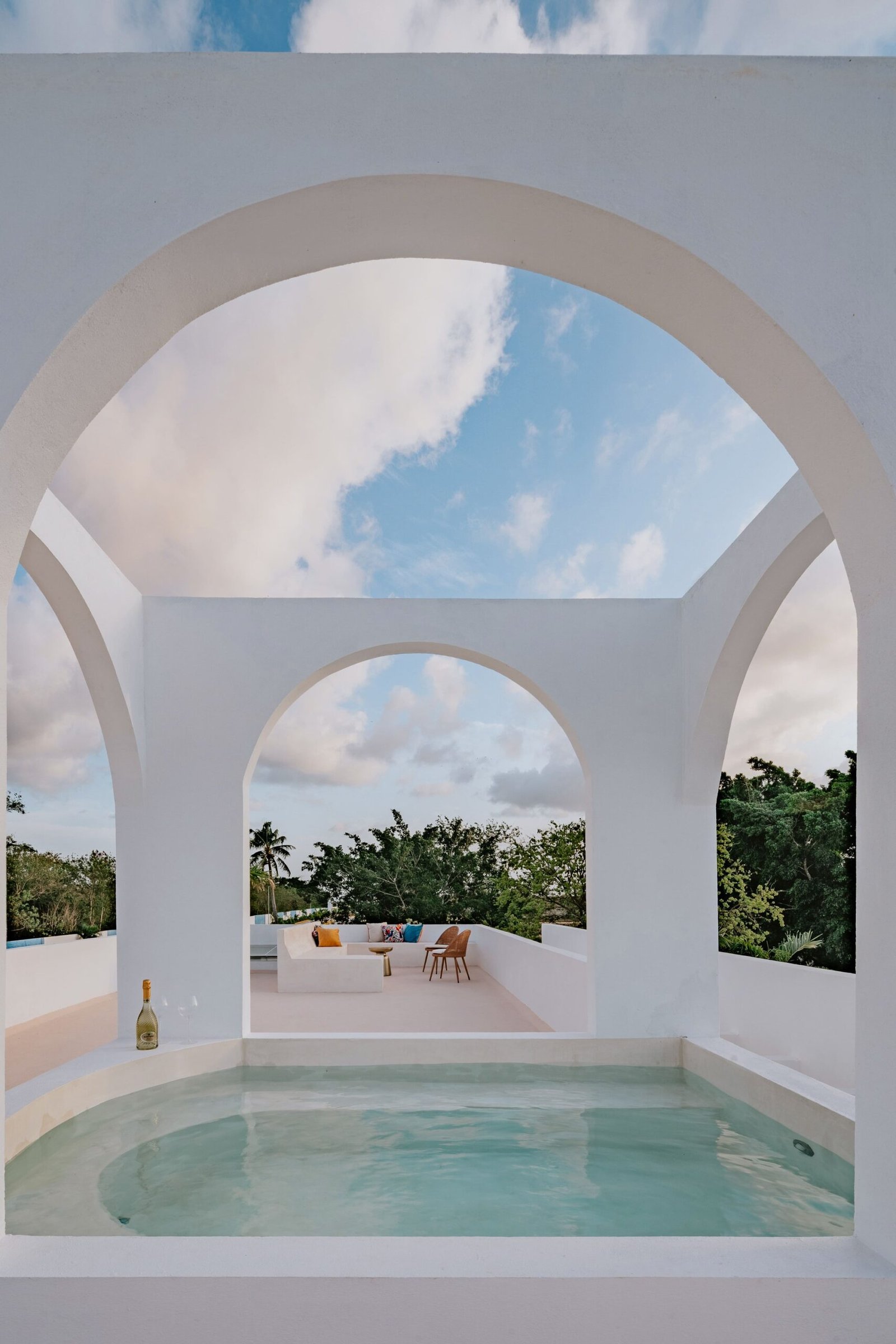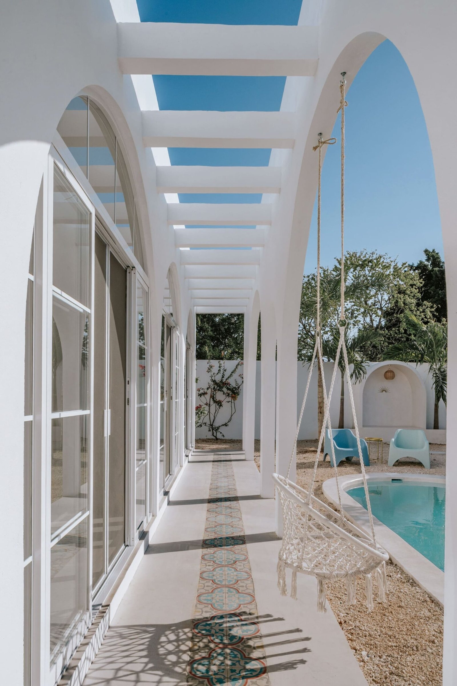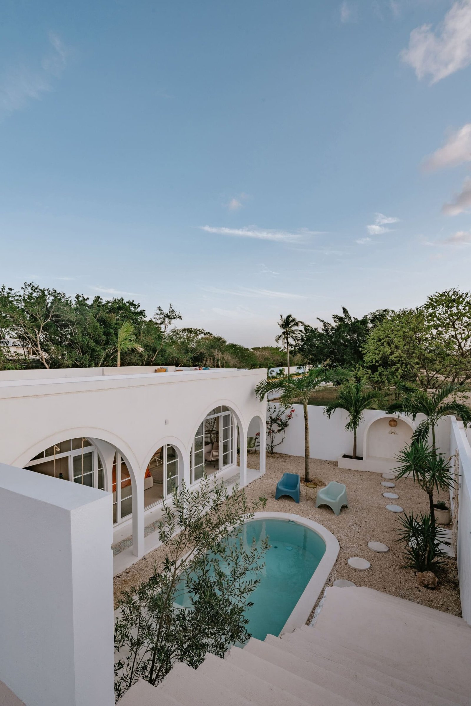 Desde el exterior, podemos apreciar la tipología de una fachada que evoca la sencillez y luminosidad de las casas tradicionales yucatecas, reinterpretada con influencias contemporáneas. Si bien sus arcos y volúmenes blancos pueden recordar estilos mediterráneos, en el contexto de Mérida, esta elección de diseño resalta una estética de frescura y amplitud, ideal para el clima cálido local.