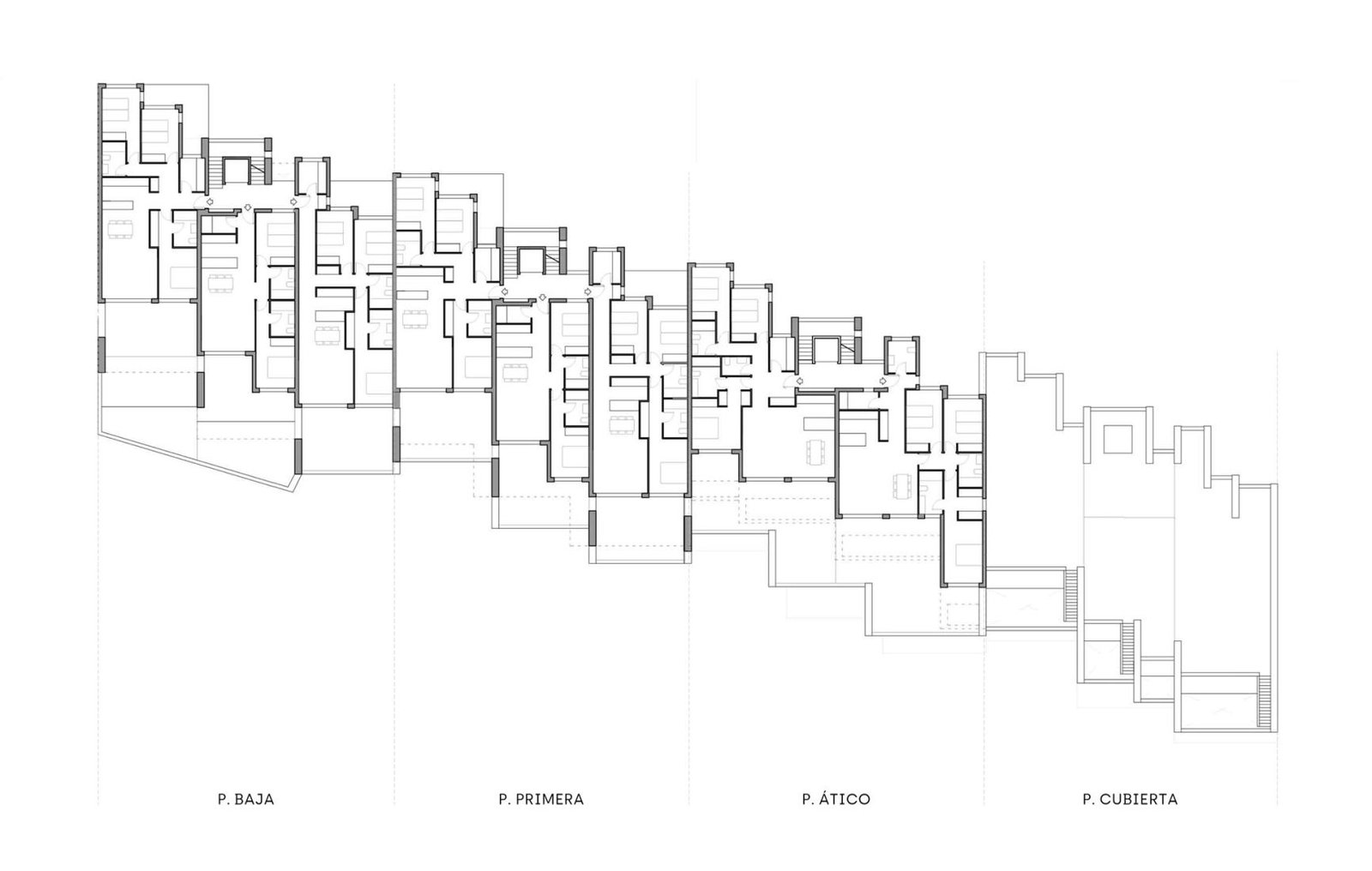 Se establece un escalonamiento en planta que permite que los planos sobre los que se disponen las terrazas mantengan cierta privacidad unos respecto de otros. Con este escalonamiento y giro, la edificación da respuesta a la dimensión urbana, (pegándose al perímetro de la parcela) la dimensión colectiva (dejando en el centro una amplia zona colectiva para el disfrute de los usuarios) y la dimensión privada (generando privacidad, con recursos típicos de la ciudad compacta mediterránea, en las viviendas).