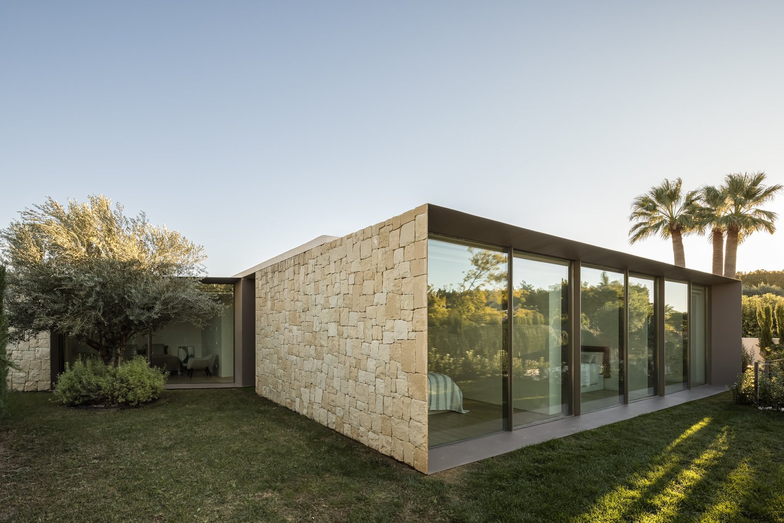 El proyecto responde con naturalidad a la geometría irregular del terreno y a las condiciones urbanísticas de la parcela. La zona de noche se configura como un cuerpo másico de muros de mampostería que actúan como anclaje estructural y visual. En contraste, el área de día se desarrolla bajo la horizontalidad del voladizo, con amplios ventanales que difuminan los límites entre interior y exterior. Desde el salón o la cocina, la continuidad visual multiplica las dimensiones del espacio y prolonga el uso hacia el jardín.