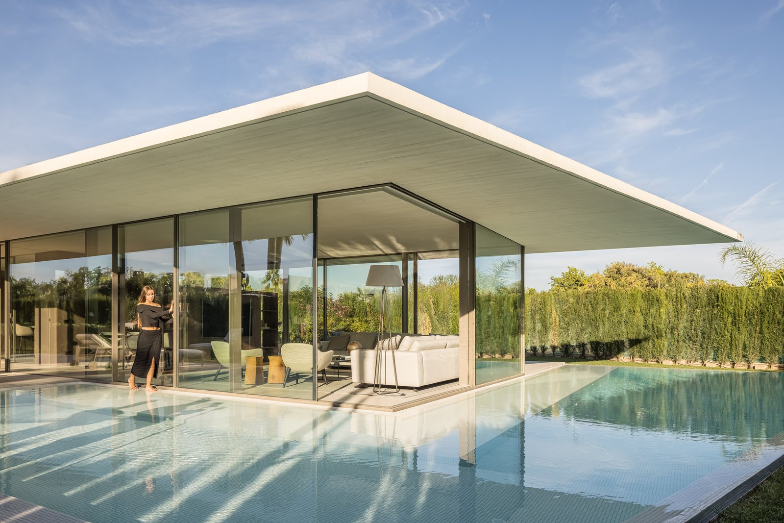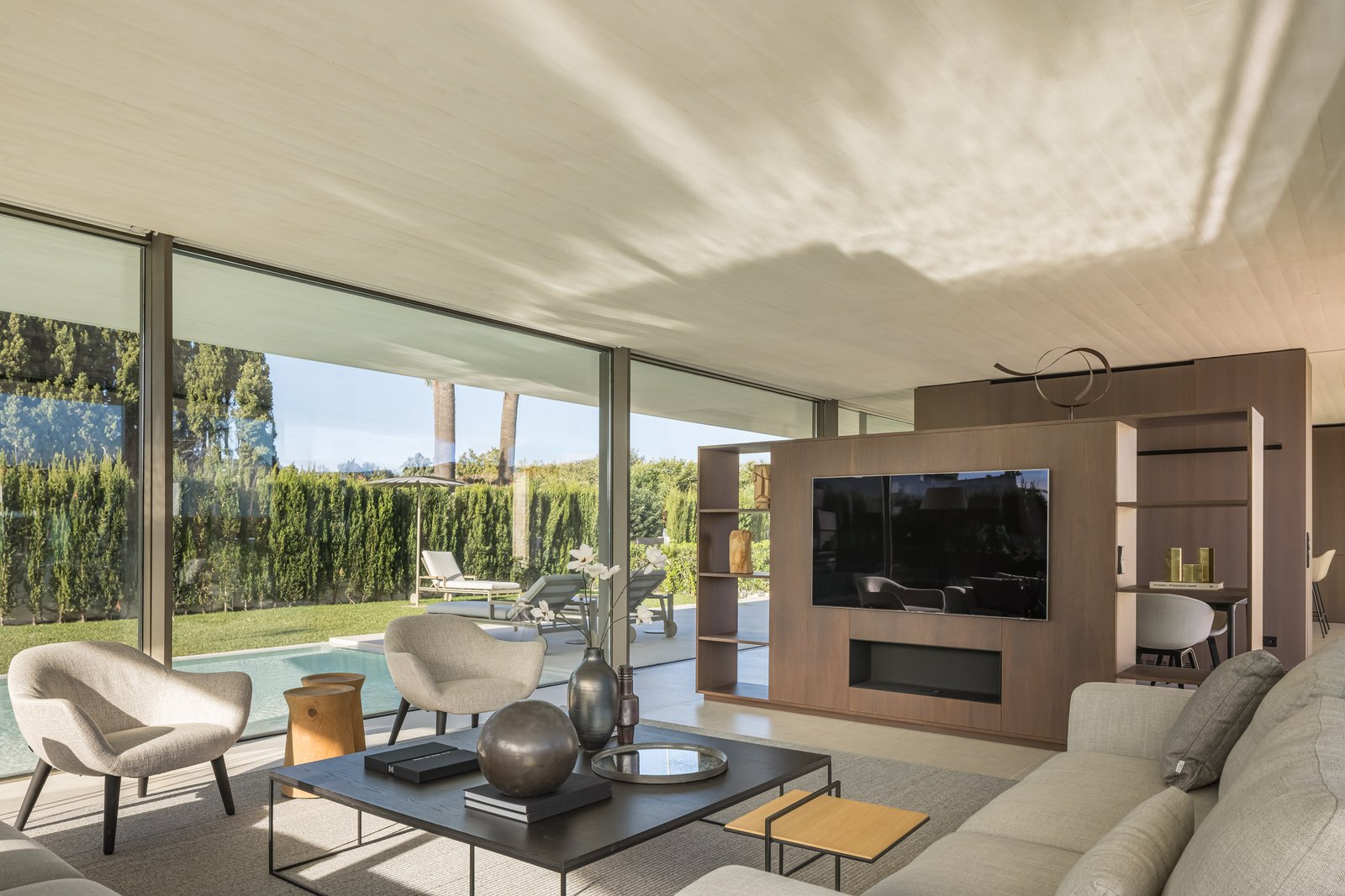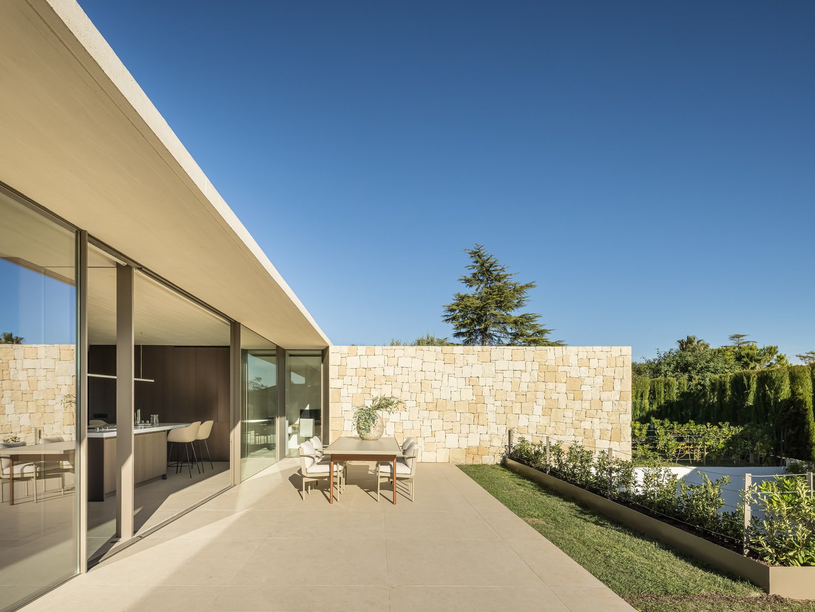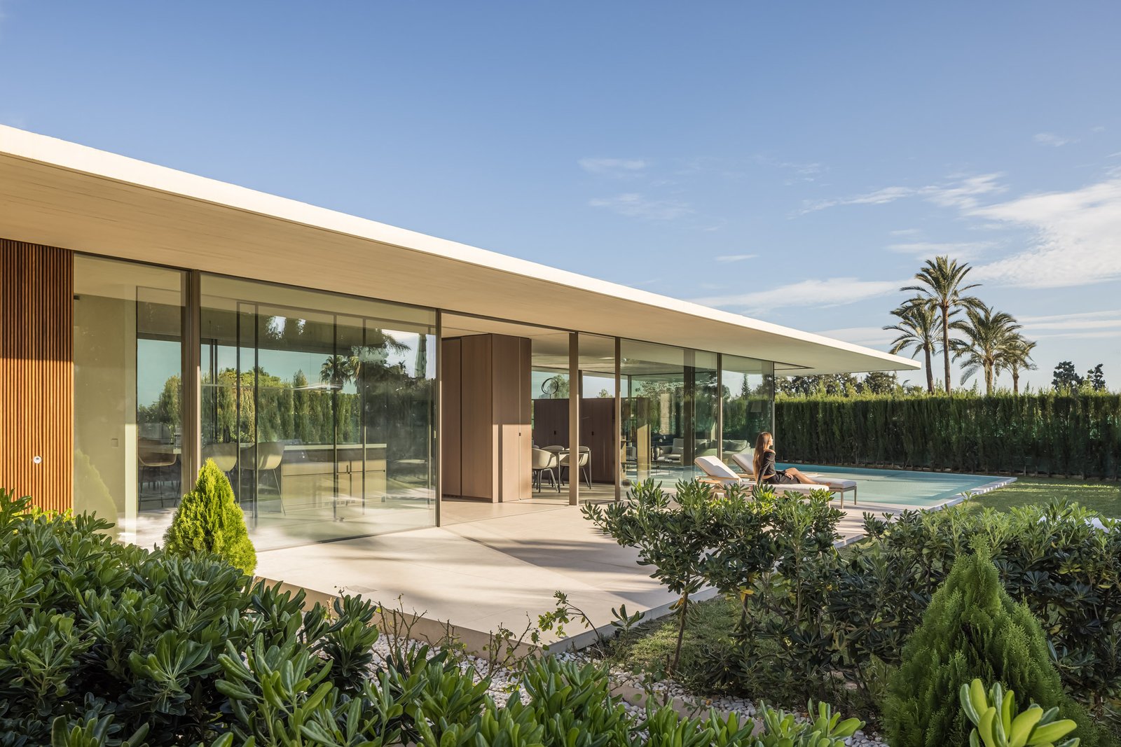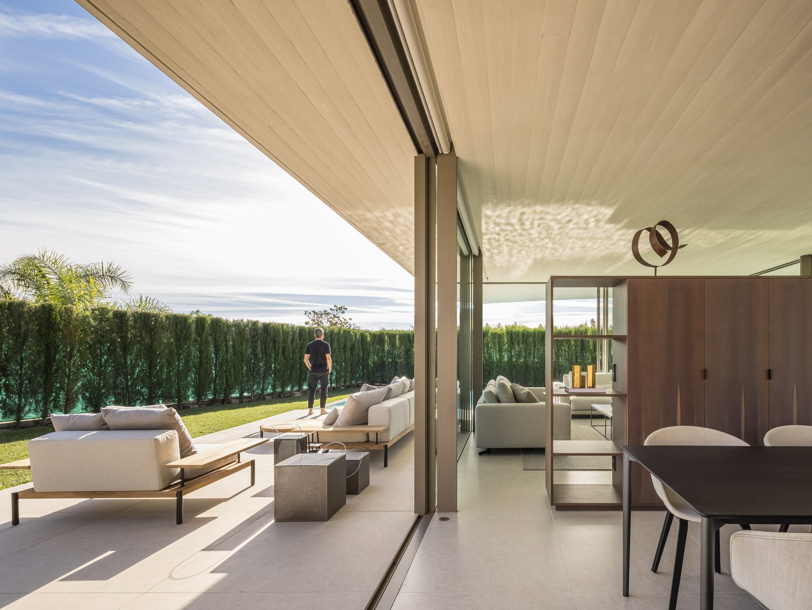 En el exterior, las terrazas de madera tropical y los pavimentos cerámicos actúan como espacios de transición entre la casa y el paisaje. La piscina abraza la zona de día y multiplica, con sus reflejos, la sensación de amplitud y ligereza que define la vivienda.