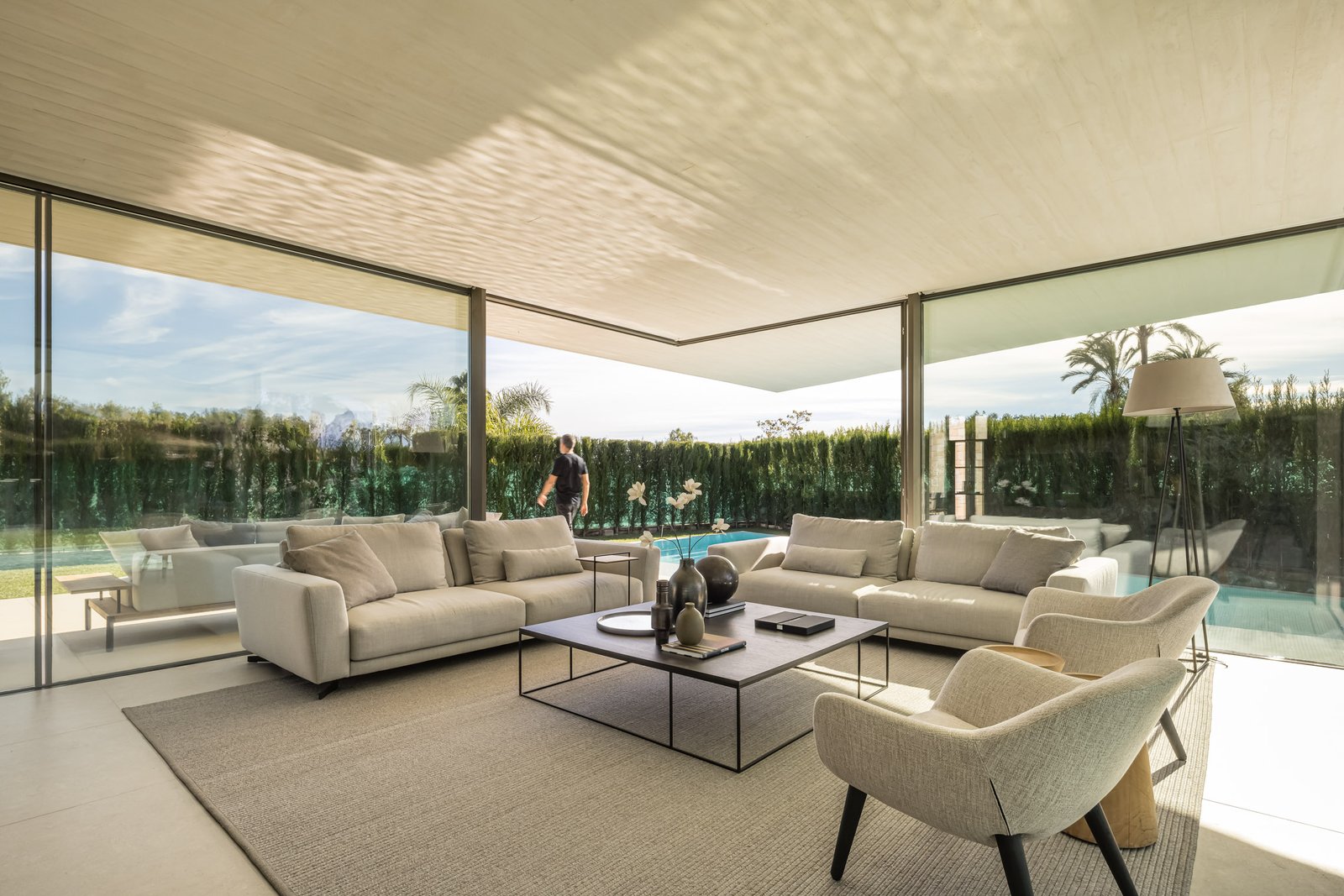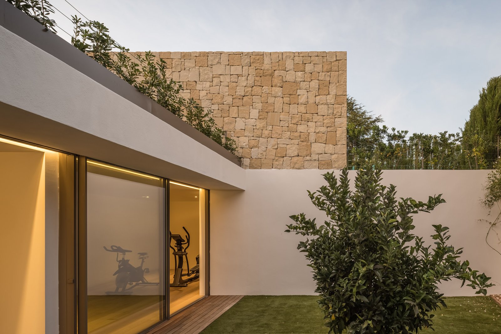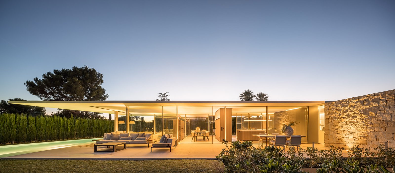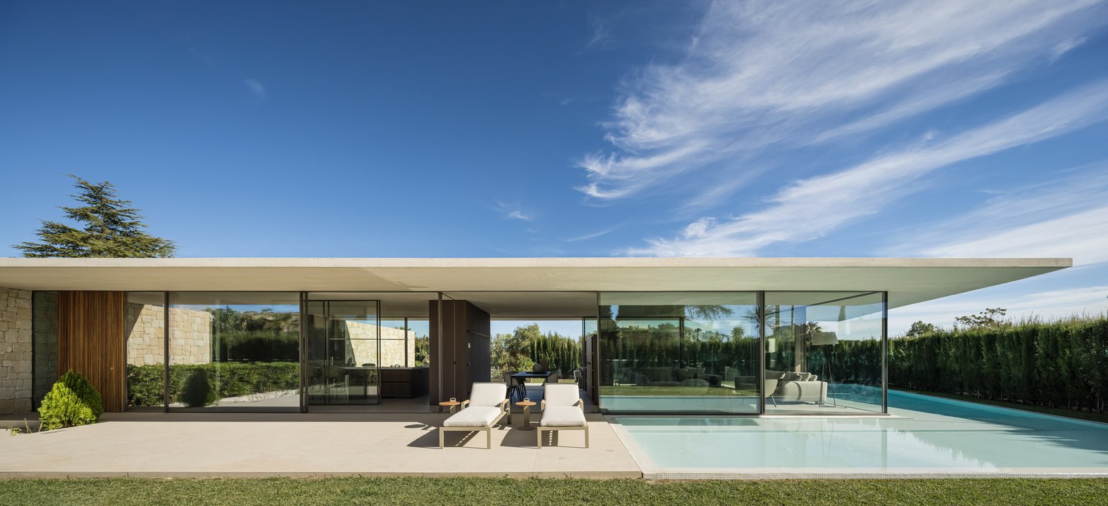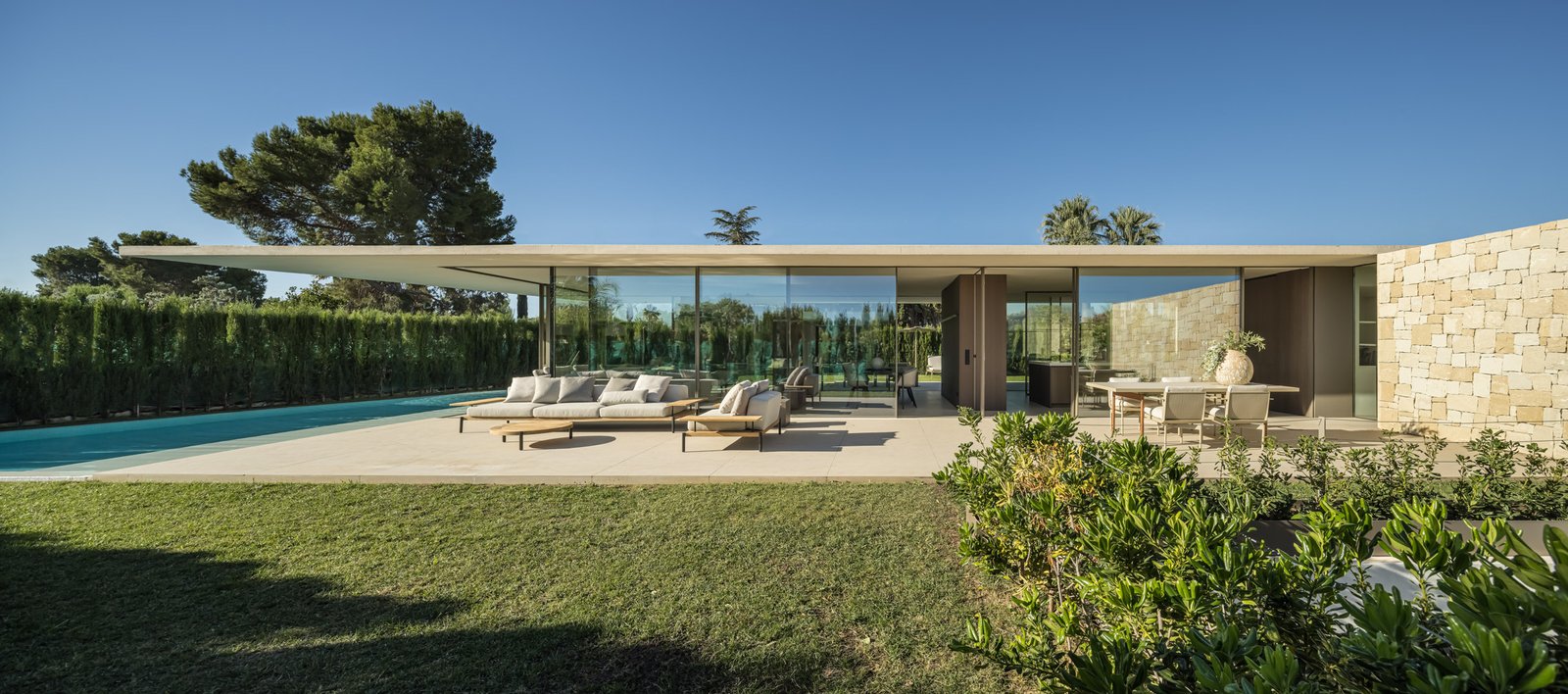 En el exterior, las terrazas de madera tropical y los pavimentos cerámicos actúan como espacios de transición entre la casa y el paisaje. La piscina abraza la zona de día y multiplica, con sus reflejos, la sensación de amplitud y ligereza que define la vivienda.