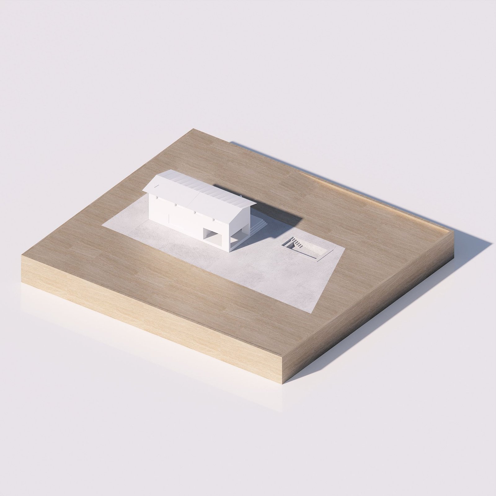 Esta casa evoca el primer dibujo de un niño: un volumen sencillo, con tejado a dos aguas y chimenea. Justificado por la necesidad de ajustarse al presupuesto, el proyecto adopta la simplicidad elemental como motivo principal de diseño. La forma del tejado a dos aguas se reduce a una lámina lo más delgada posible, suficiente para garantizar la impermeabilización y el desagüe directo al exterior, sin necesidad de canaletas interiores.