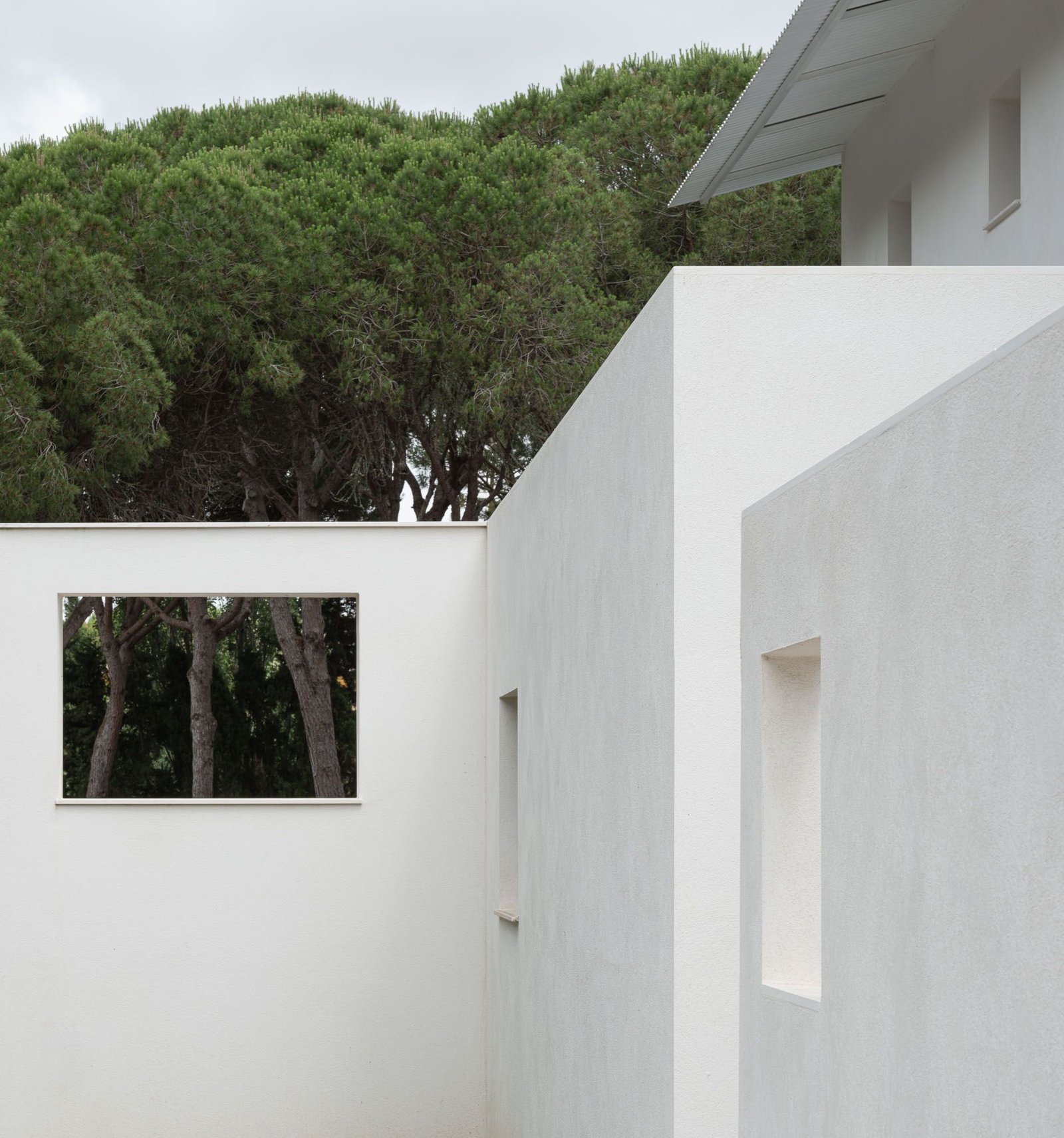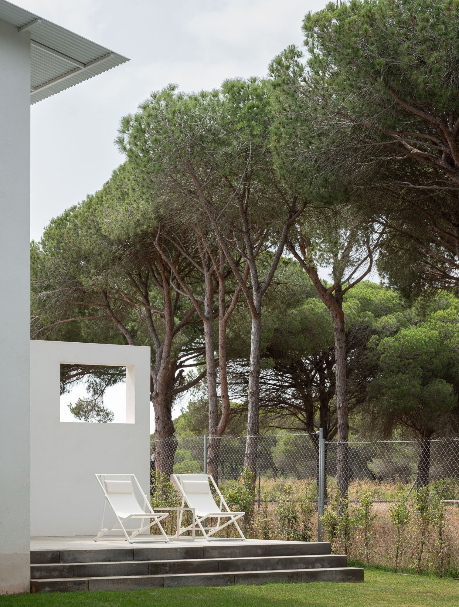 Es precisamente en estos volúmenes anexos donde el proyecto se permite cierta libertad, algunos gestos con los que el arquitecto busca deleitarse: aberturas que enmarcan vistas, patios que median entre el exterior y el interior… Hacia el patio trasero, un gran porche se presenta como un profundo vacío elevado 50 cm sobre el nivel natural del suelo, constituyendo un podio que evoca otras arquitecturas clásicas.