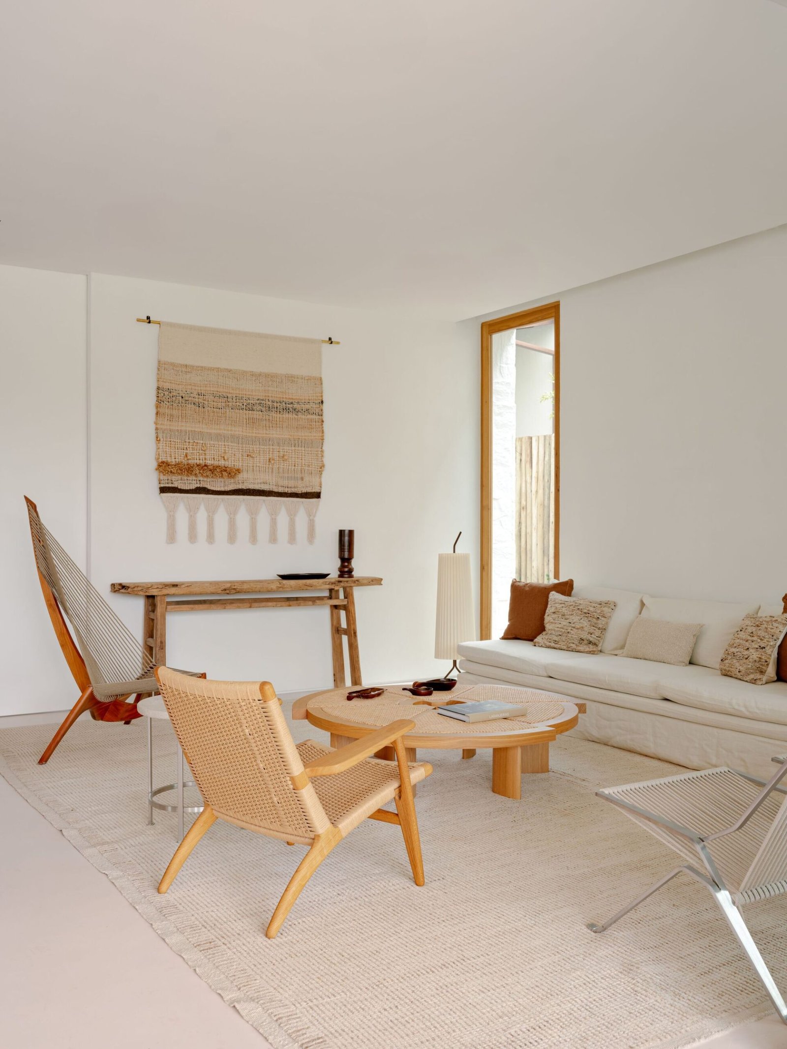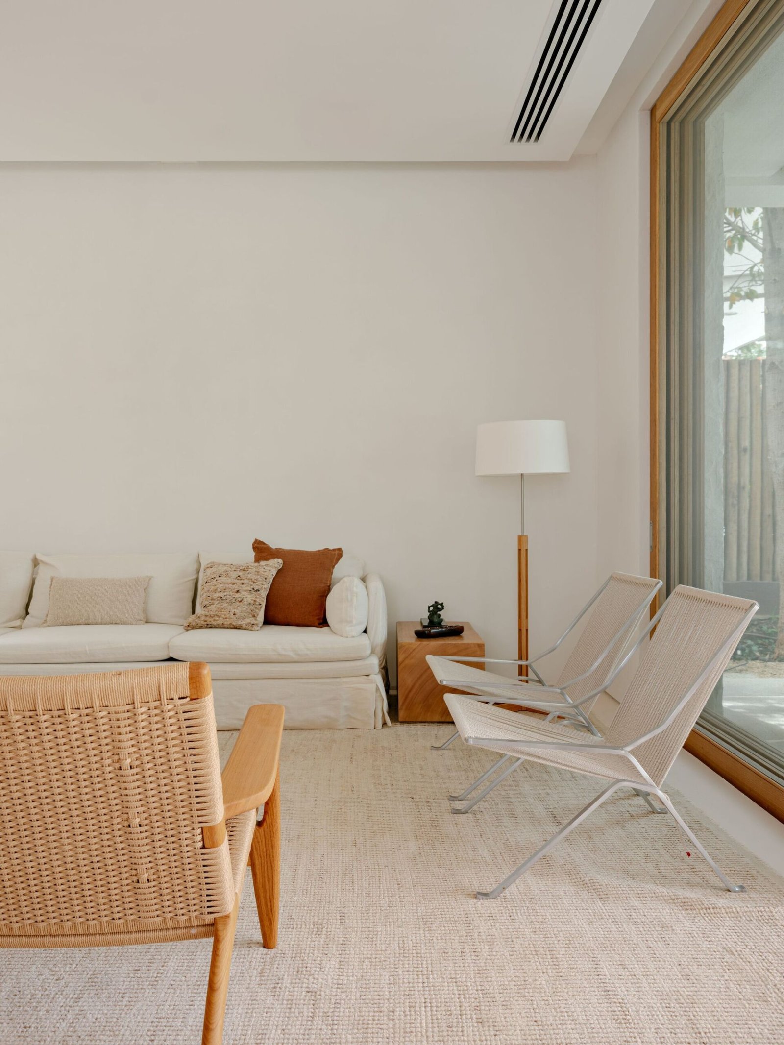 La paleta de materiales sigue tonos claros: suelos de cemento blanco, madera clara, tejidos naturales y muebles escandinavos seleccionados con precisión. El conjunto transmite ligereza y atmósfera playera, sin renunciar a la densidad formal del volumen construido. El proyecto equilibra robustez y transparencia, permanencia y apertura, en una casa orientada hacia el canal, pero también hacia sí misma.