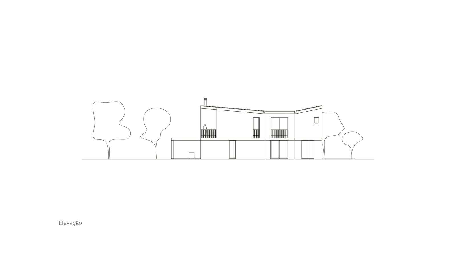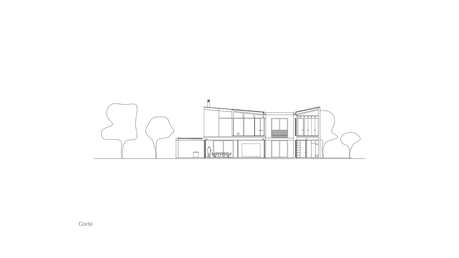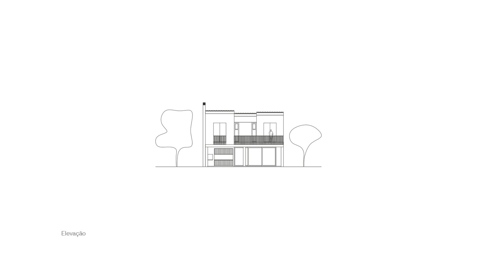Esta superficie, al mismo tiempo sólida y luminosa, define el lenguaje de la casa. Un cinturón de hormigón blanco marca horizontalmente los dos niveles, en la losa intermedia y en la coronación de la cubierta, reforzando el rigor del diseño. El tejado a dos aguas cumple con los requisitos del condominio, regulado por el patrimonio histórico de Paraty, y se integra a la volumetría con naturalidad.